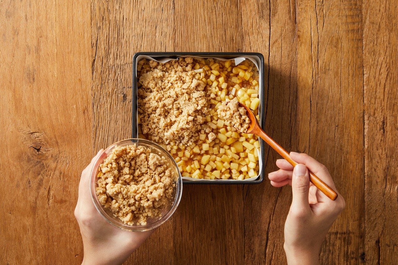 평평하게 올린 사과 위로 크럼블 반죽을 얹어 주세요.