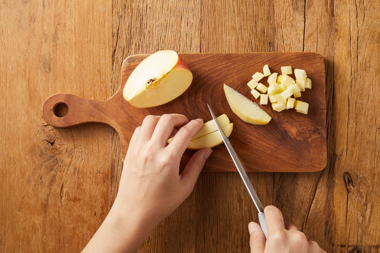 세척한 사과를 작은 크기의 큐브 모양으로 잘라 주세요.