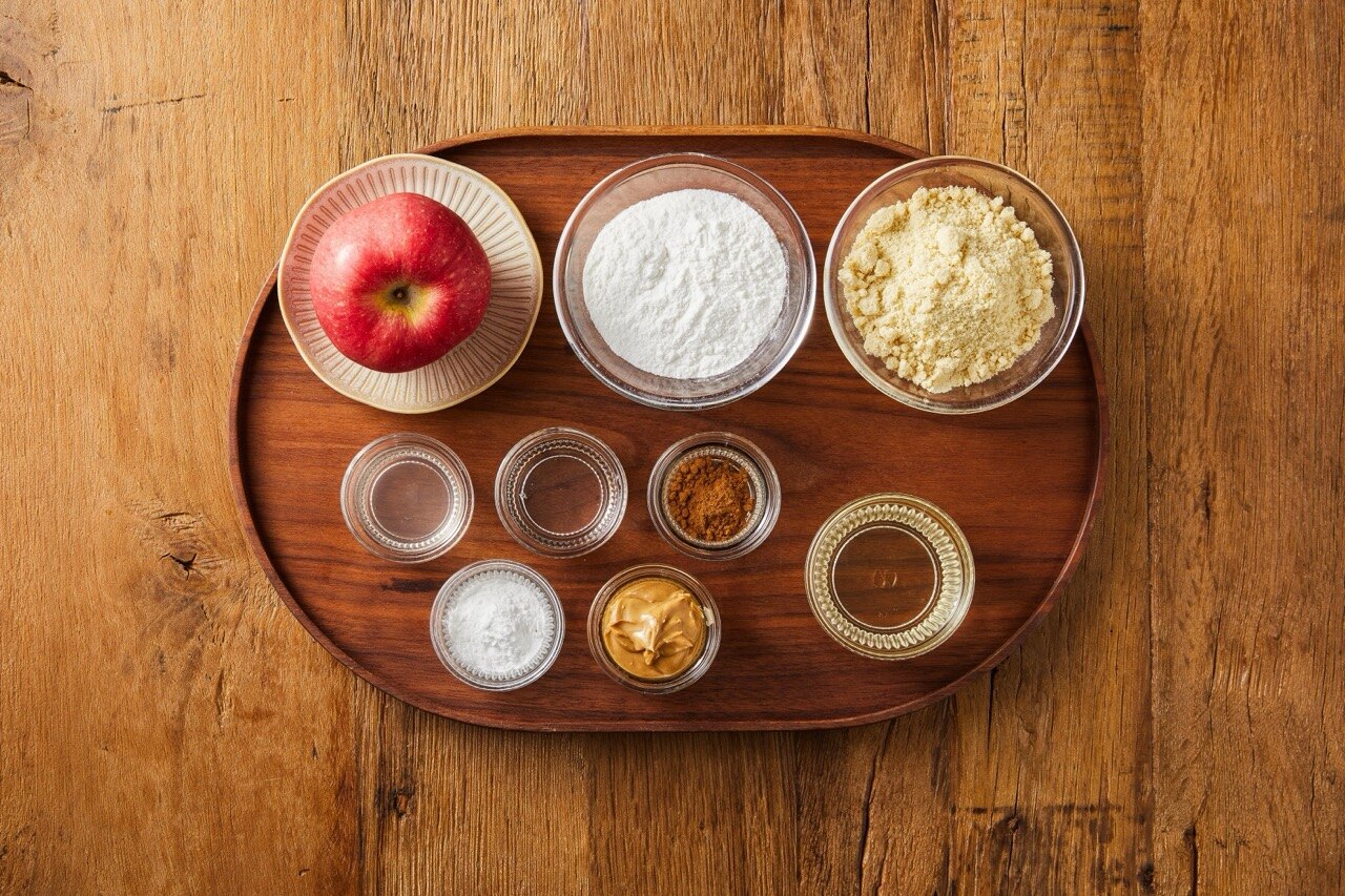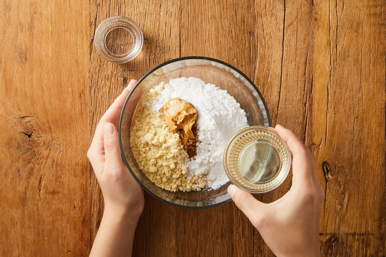 적당한 크기의 볼에 밀가루, 아몬드 가루, 땅콩버터, 기름, 올리고당을 넣어 주세요.