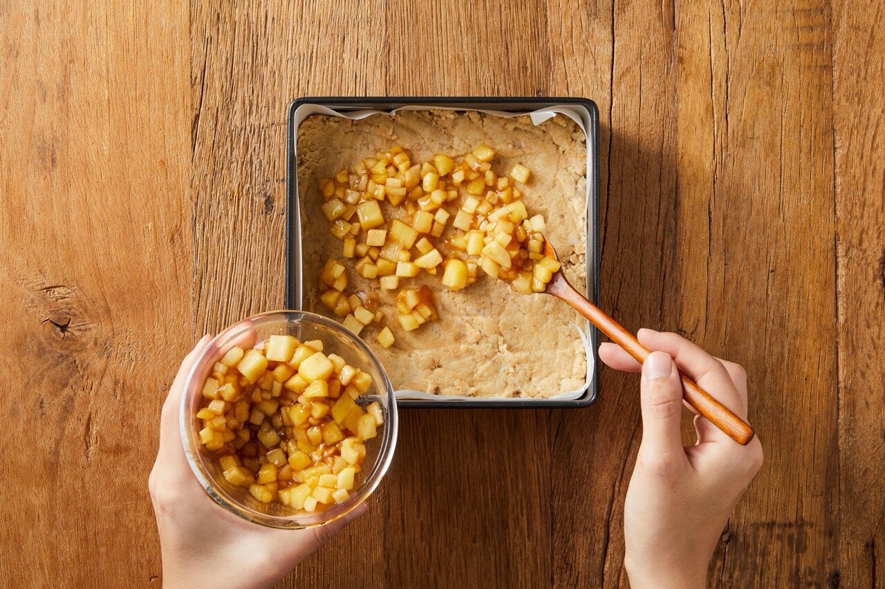 오븐용 트레이에 크럼블 반죽을 깔아준 뒤, 졸인 사과를 올려 주세요.