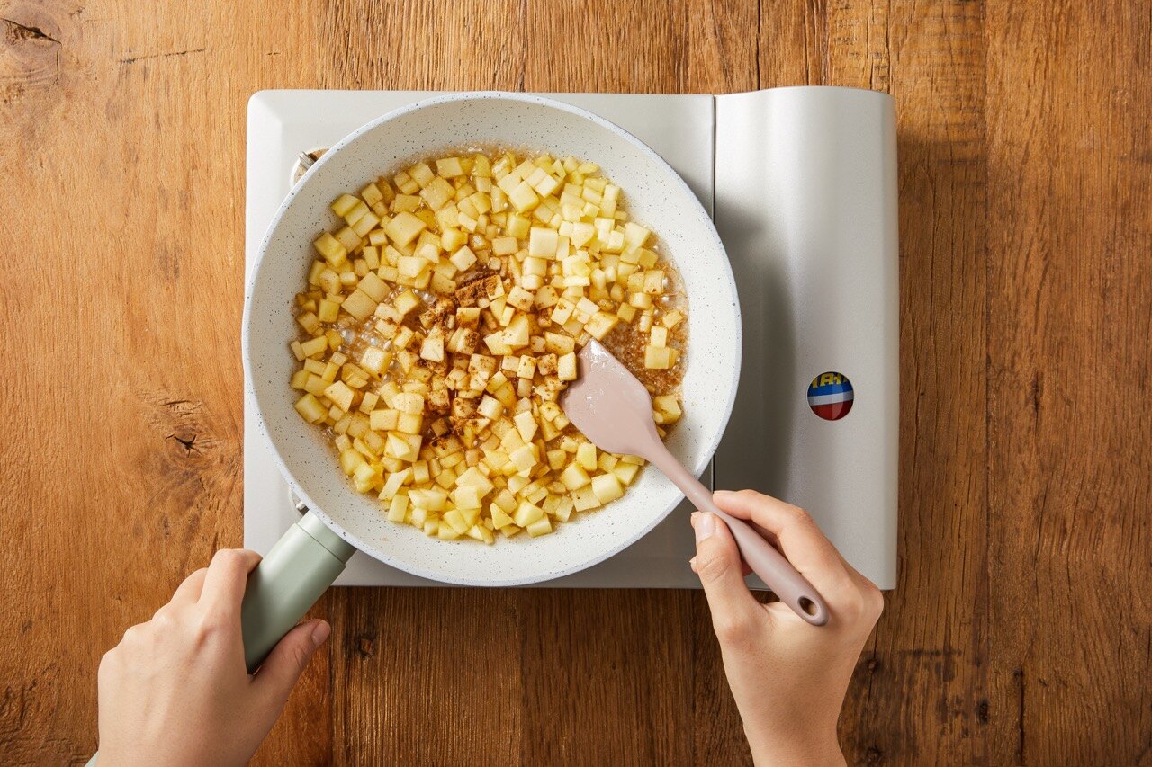 사과, 레몬즙, 올리고당, 시나몬 가루를 넣고 5분가량 졸여 주세요.