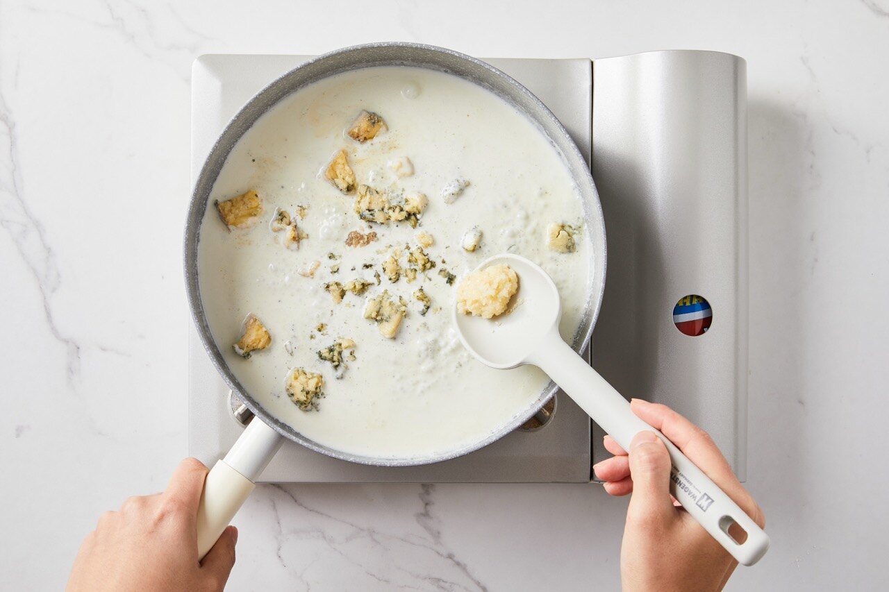 예열된 팬에 생크림과 블루치즈, 다진마늘을 넣고 치즈가 녹을 정도로만 끓여 주세요.