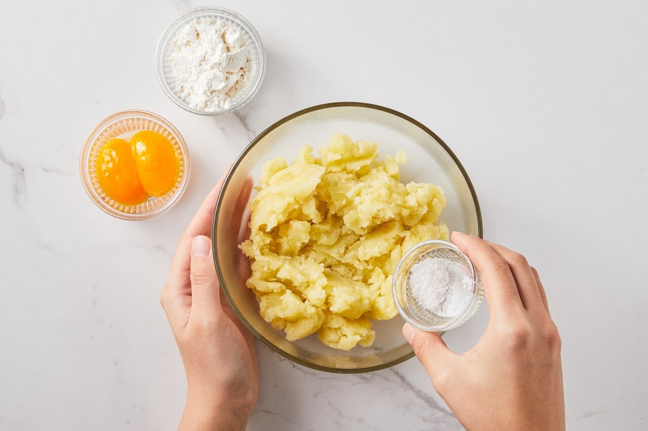 으깬 감자에 소금, 노른자, 밀가루를 넣고 잘 섞어 주세요