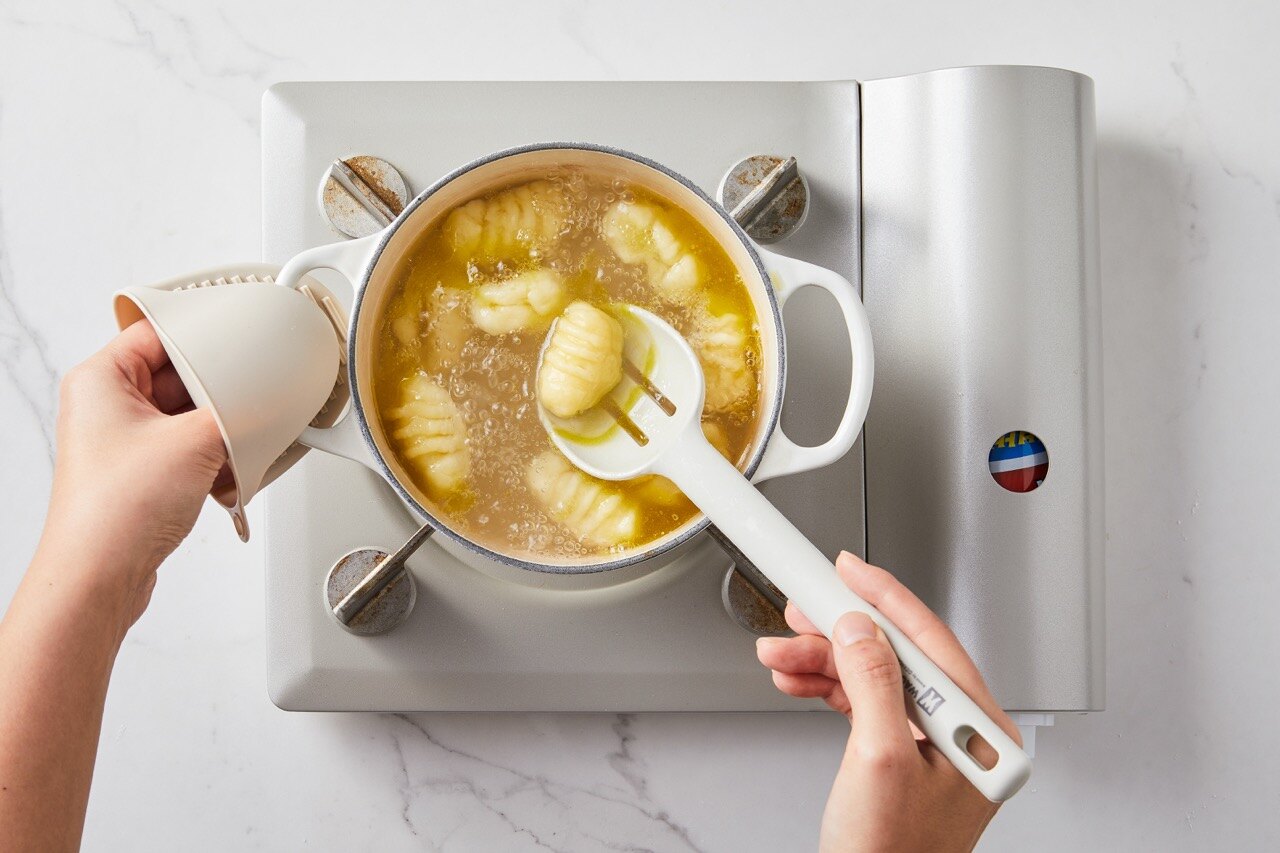 끓는 물에 올리브유를 넣은 다음, 뇨끼가 떠오를 때까지 삶아 주세요.