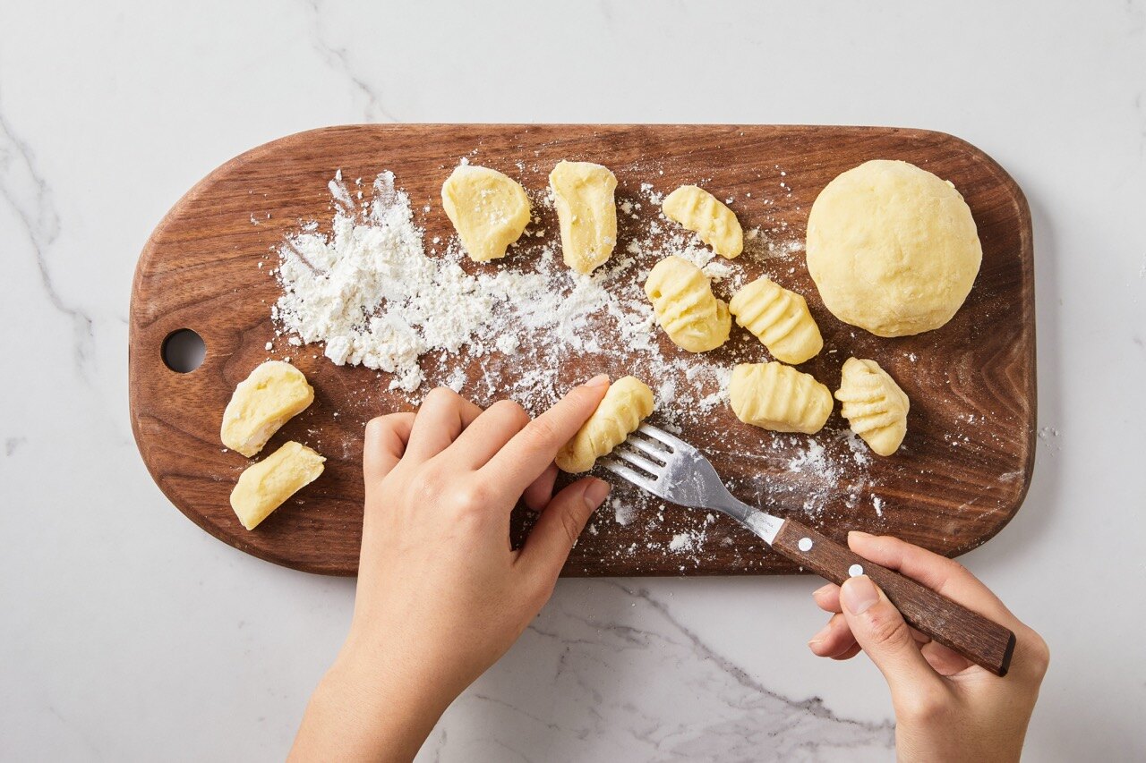 밀가루를 바른 도마에 뇨끼 반죽을 5백원 동전 크기로 잘라낸 후, 포크 뒷면으로 밀어 모양을 내 주세요.