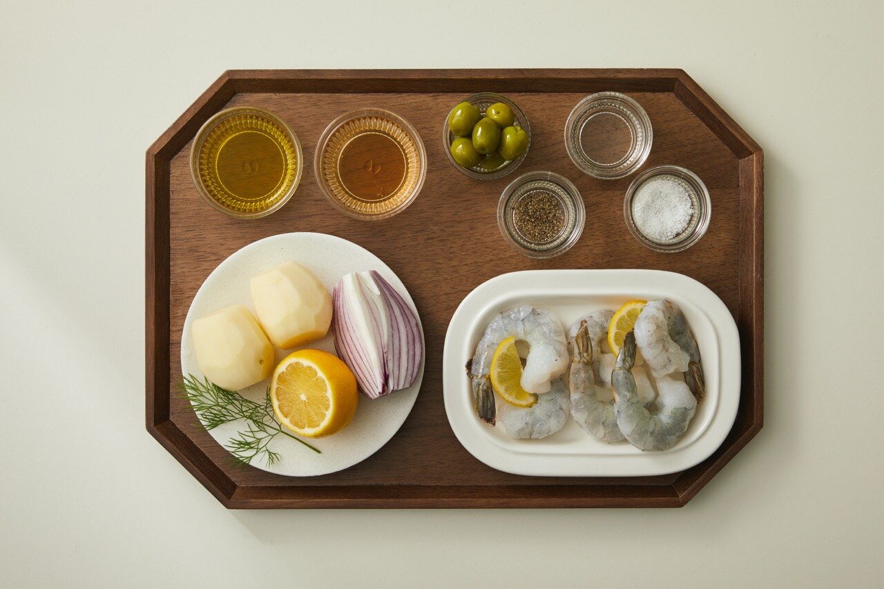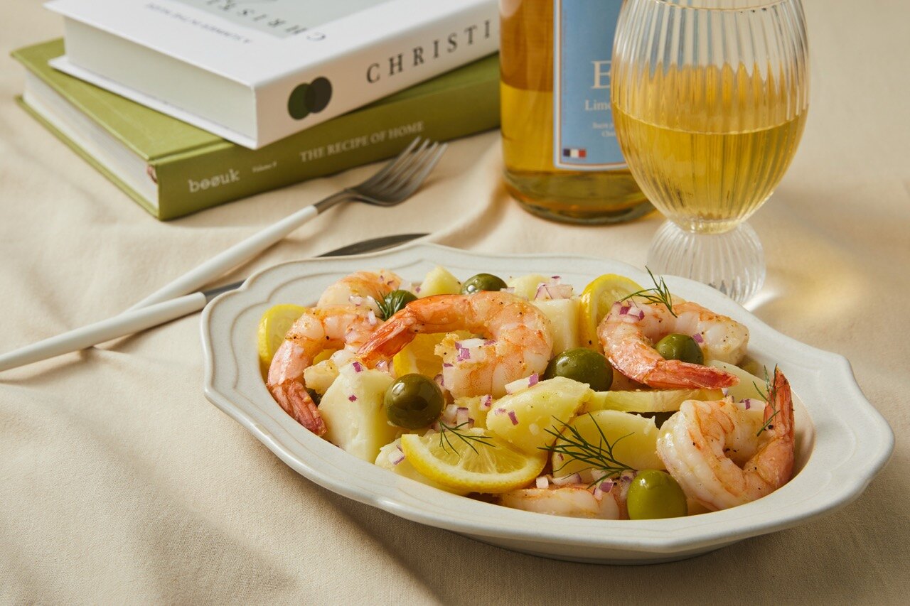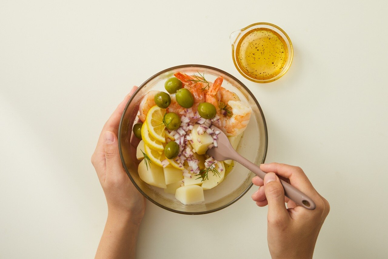 볼에 감자와 새우, 레몬, 적양파, 올리브, 딜과 만들어 둔 드레싱을 넣고 재료가 상하지 않게 가볍게 버무려 주세요.