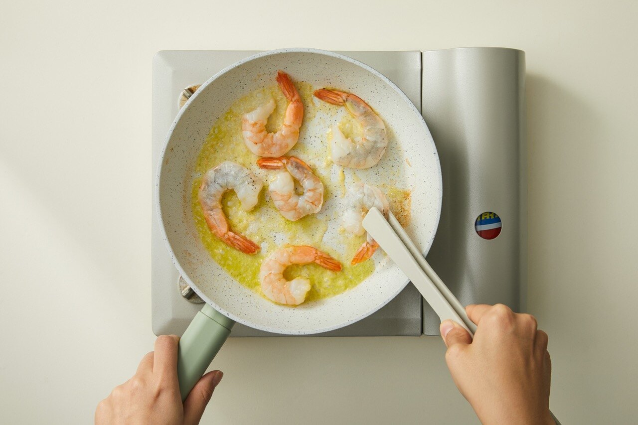 새우에 소금과 후추 간을 하여 노릇하게 익혀 주세요.