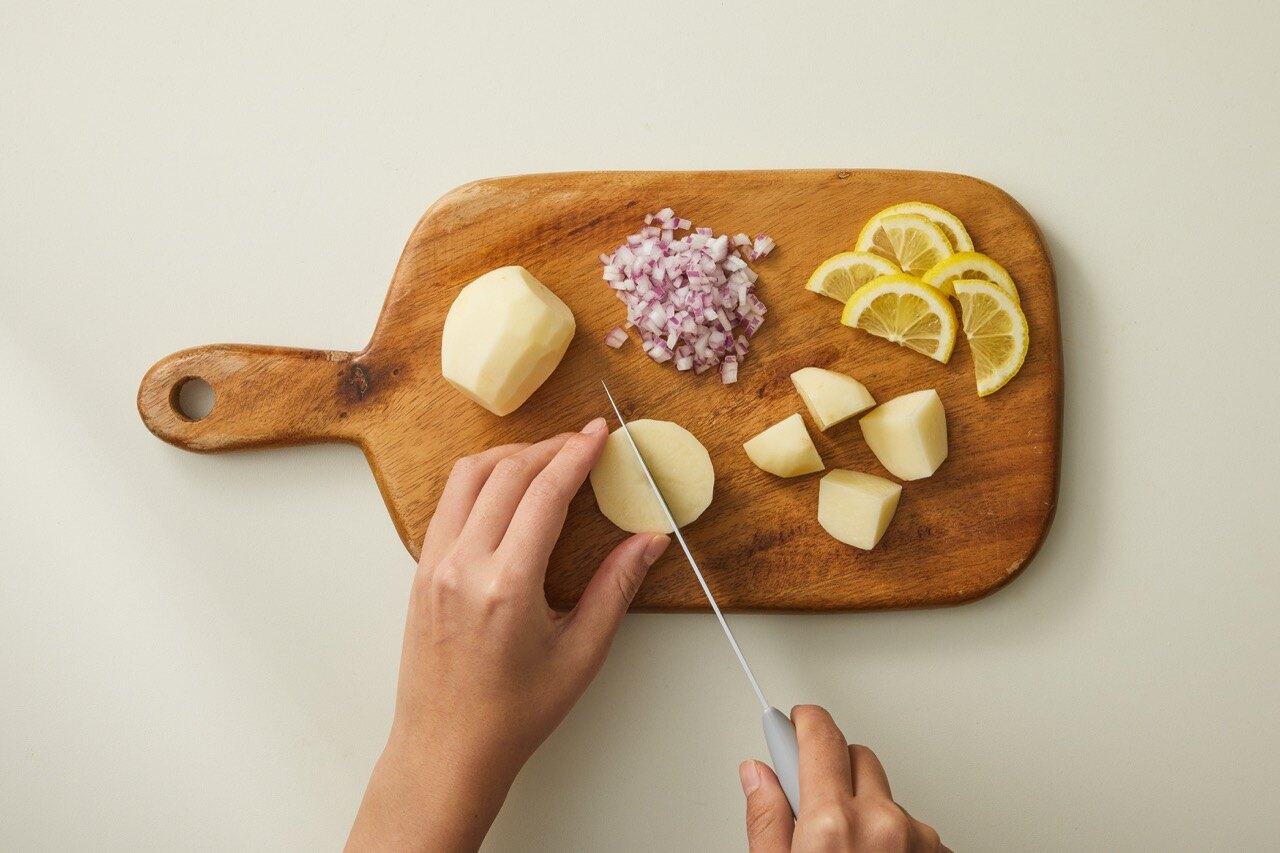감자는 1/4등분, 레몬은 하프 슬라이스, 적양파는 잘게 다져 준비해 주세요.