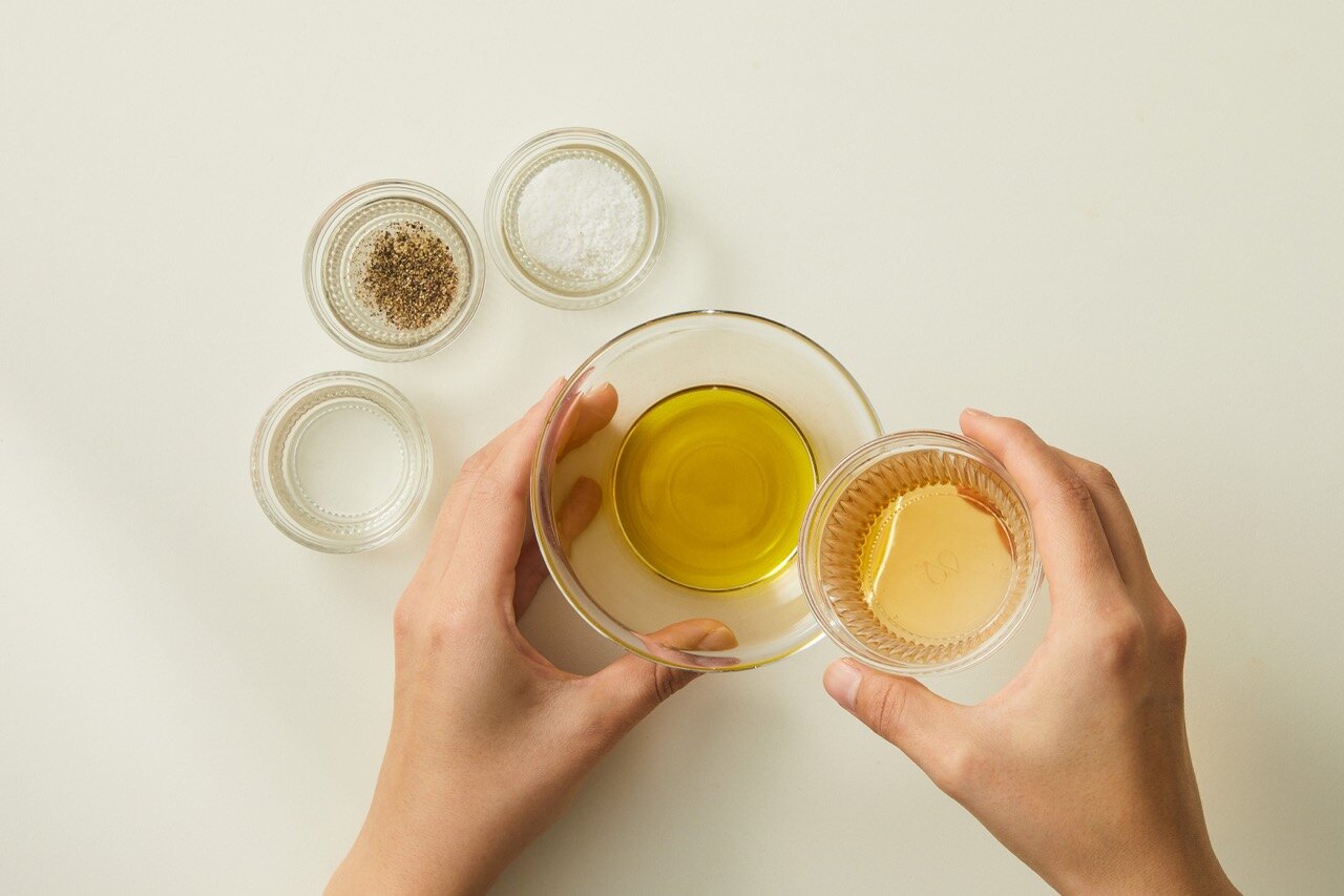 올리브유, 화이트 발사믹비네거, 올리고당, 후추, 소금을 섞어 드레싱을 만들어 주세요.