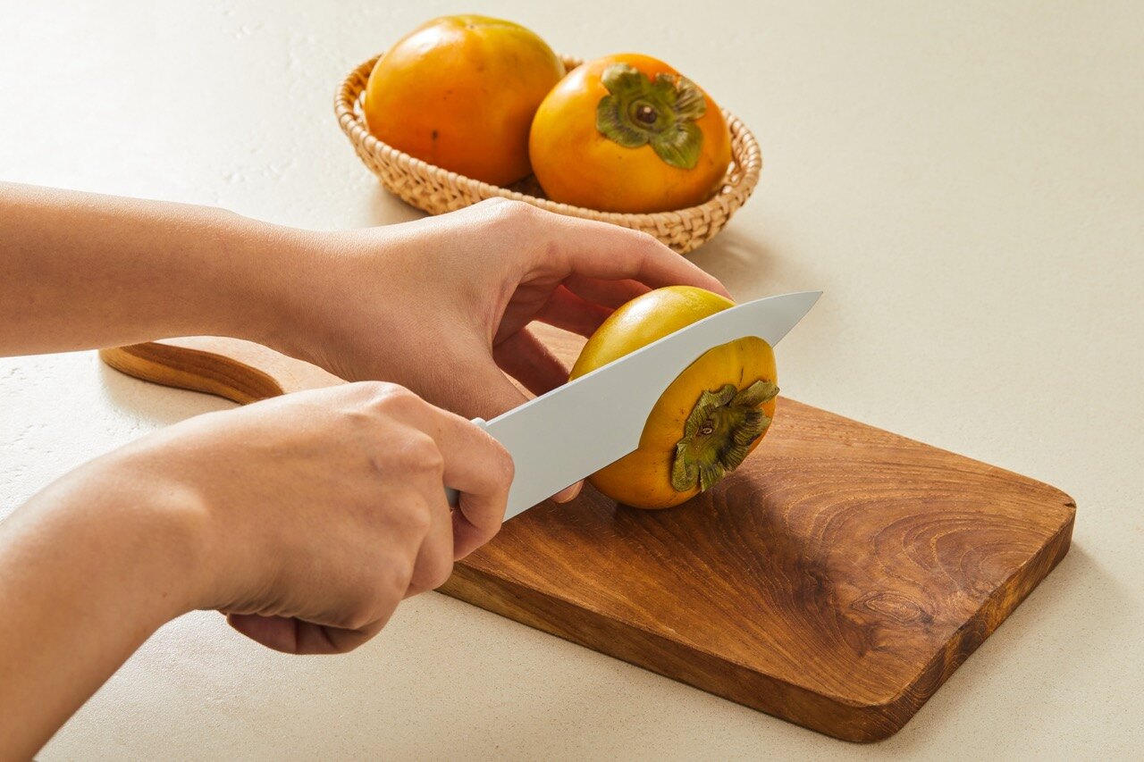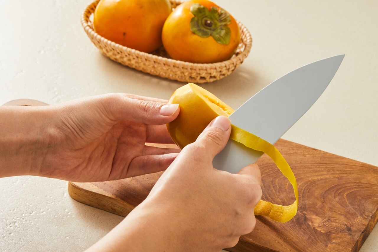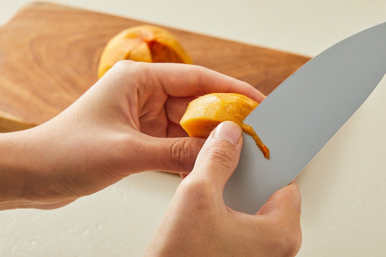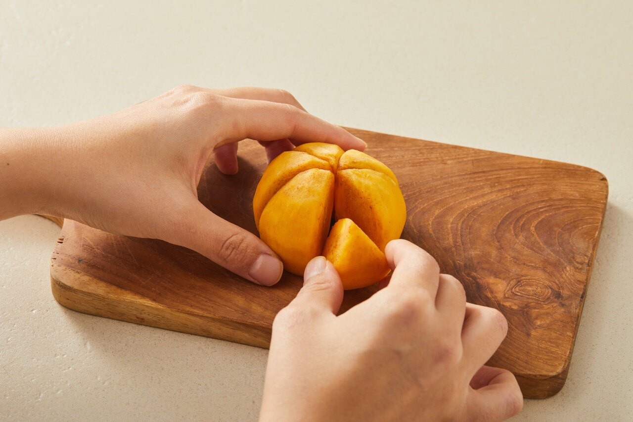 밑동을 제거한 단감의 나머지 껍질을 잘라 주세요.