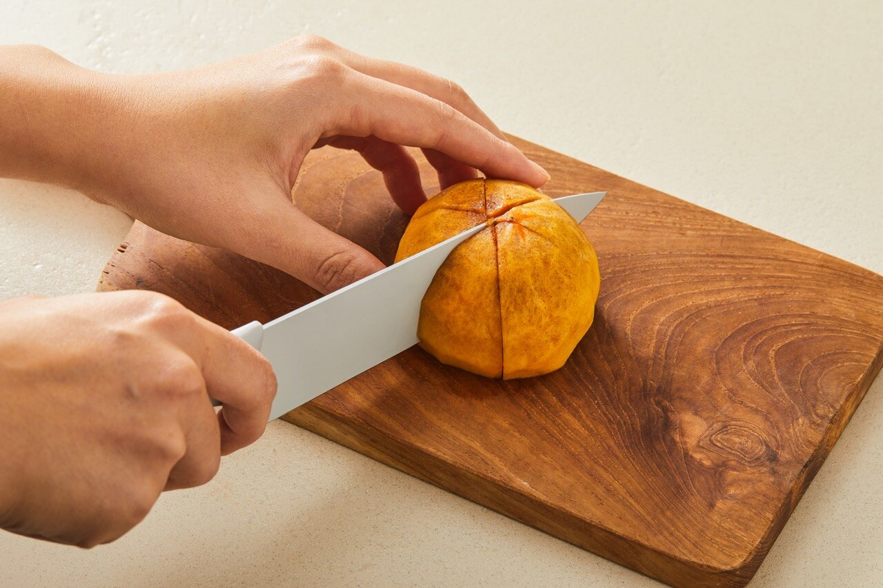 6등분한 감의 모든 모서리를 둥글게 깎아주세요.
