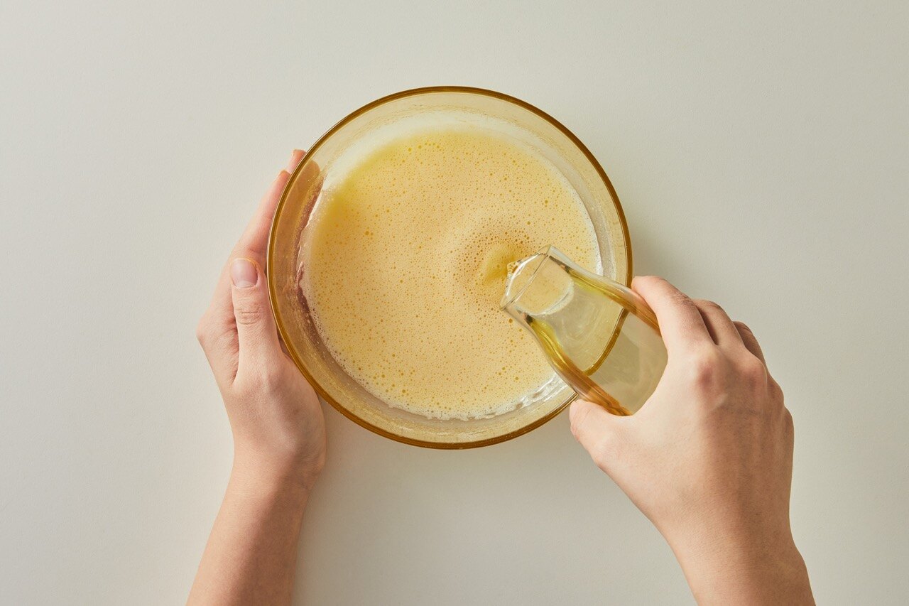 섞인 반죽에 카놀라유를 넣어 주세요.