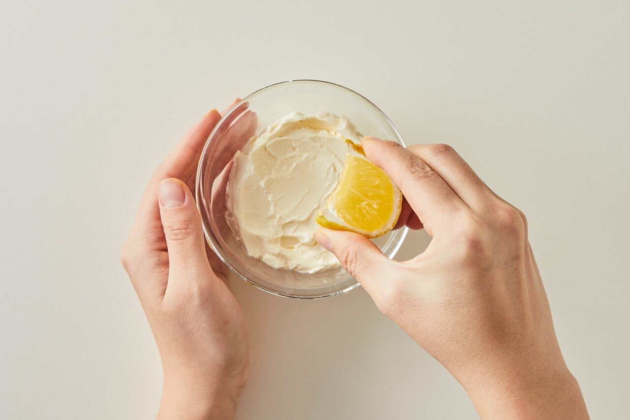분량의 크림치즈에 레몬을 짜서 넣은 뒤 잘 섞어 주세요.