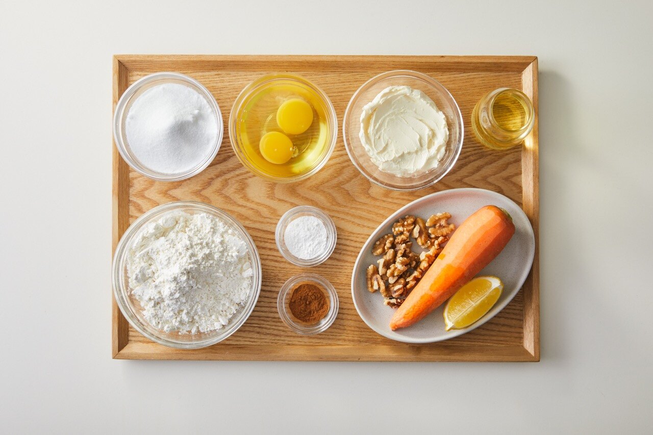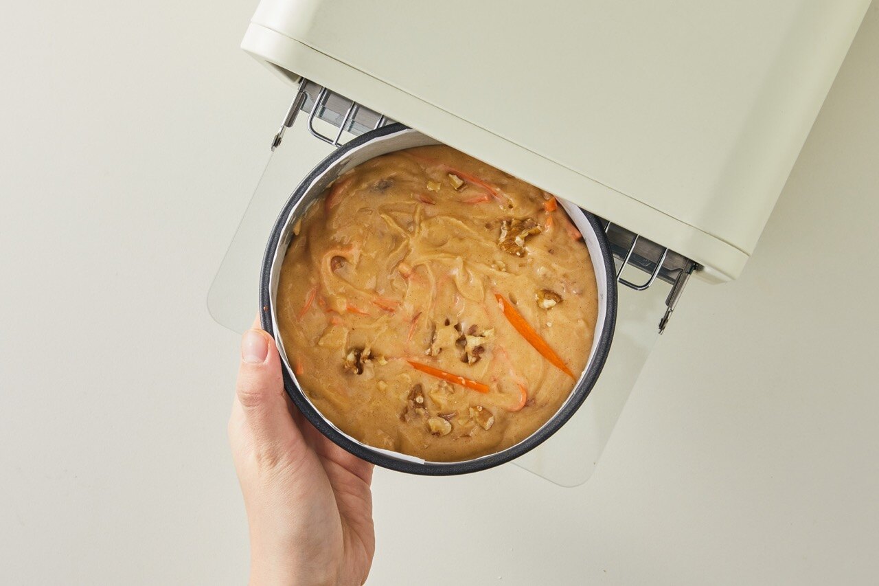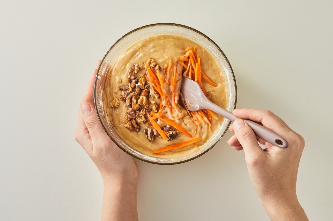 구운 호두와 채썬 당근도 넣고 섞은 뒤, 케익 트레이에 반죽을 담아 주세요.
