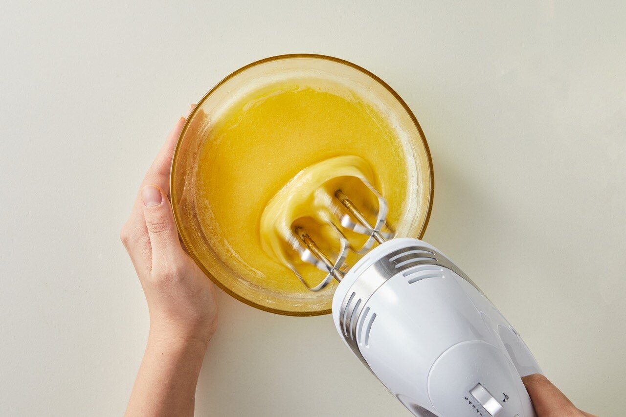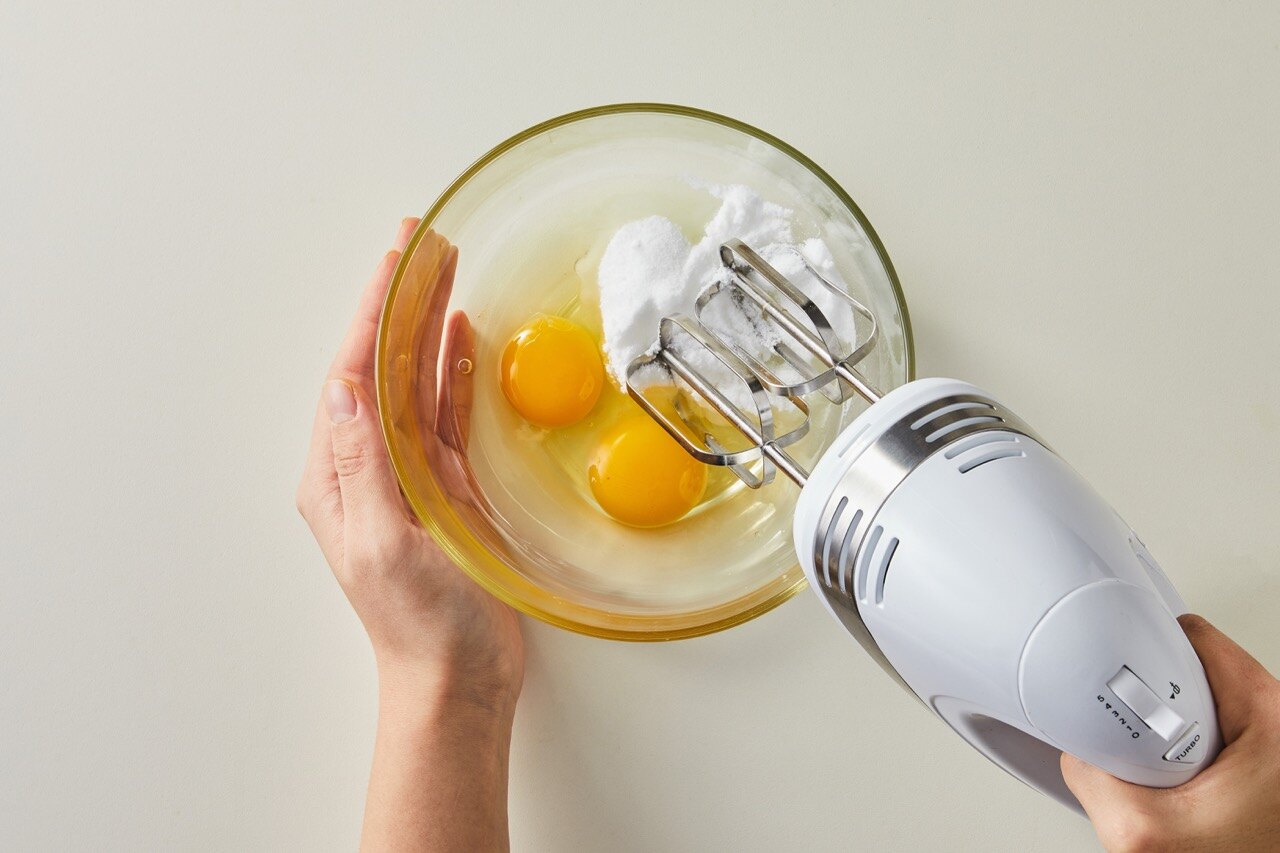 넓은 볼에 계란과 설탕을 넣고 휘핑기로 섞어 주세요.