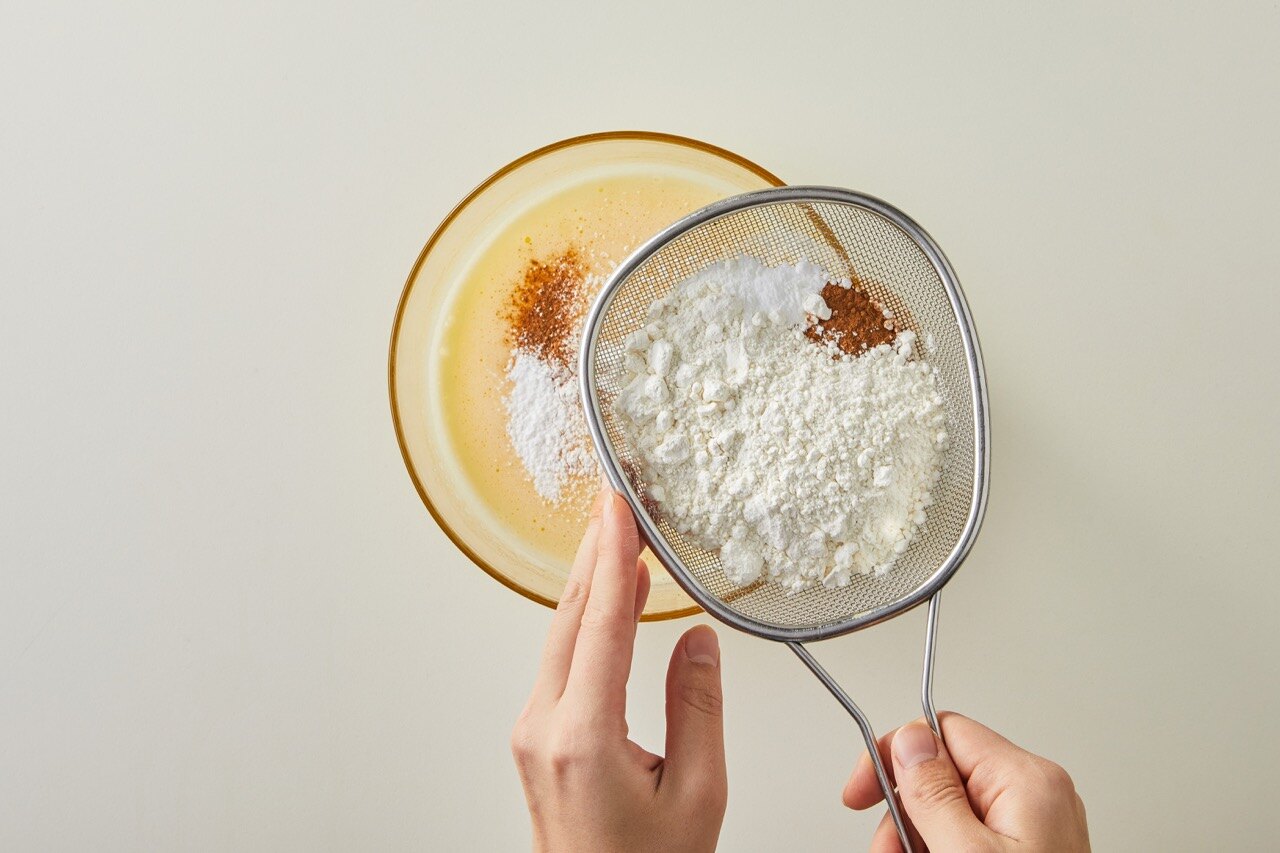 박력분, 계피가루, 베이킹 파우더를 체에 쳐서 넣어 주세요.