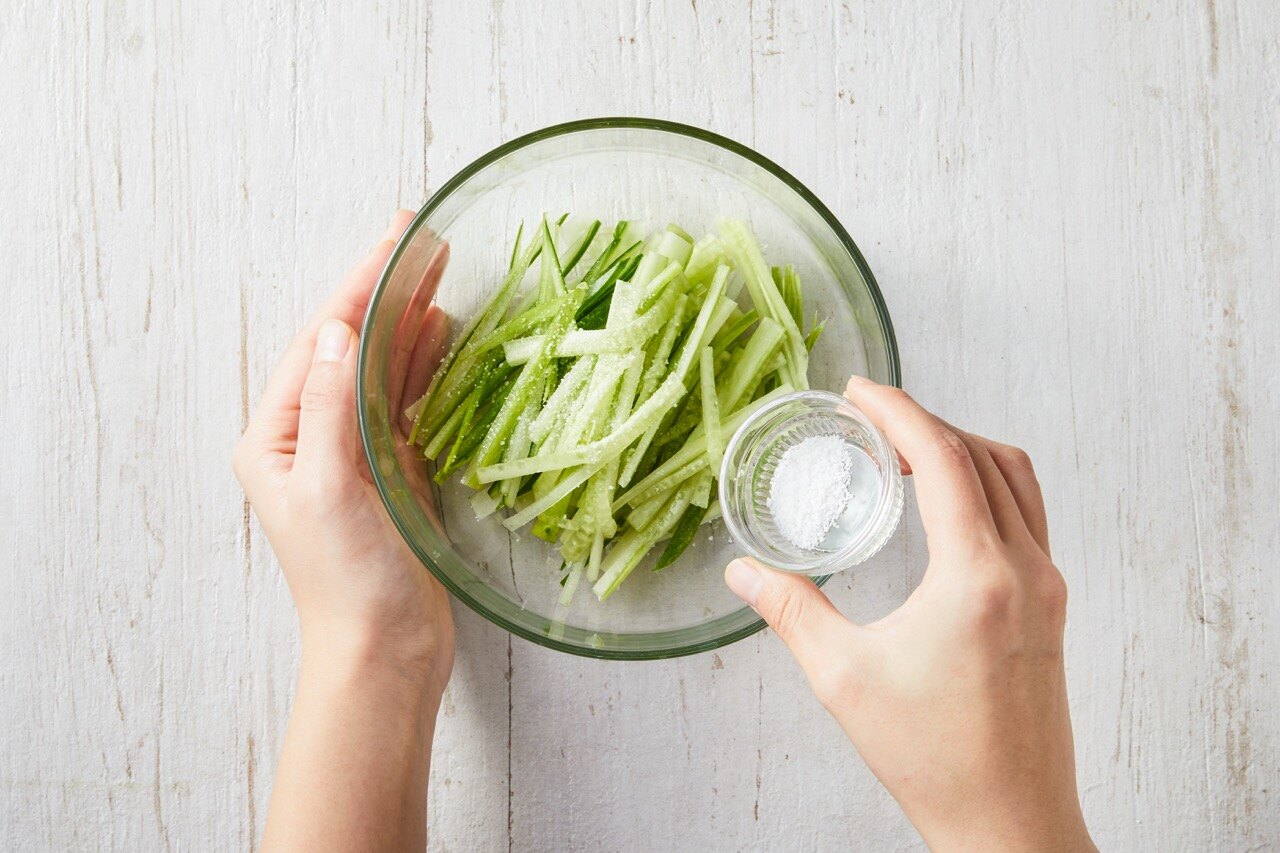 채 썬 오이에 소금을 넣고 10분 가량 절여 주세요.