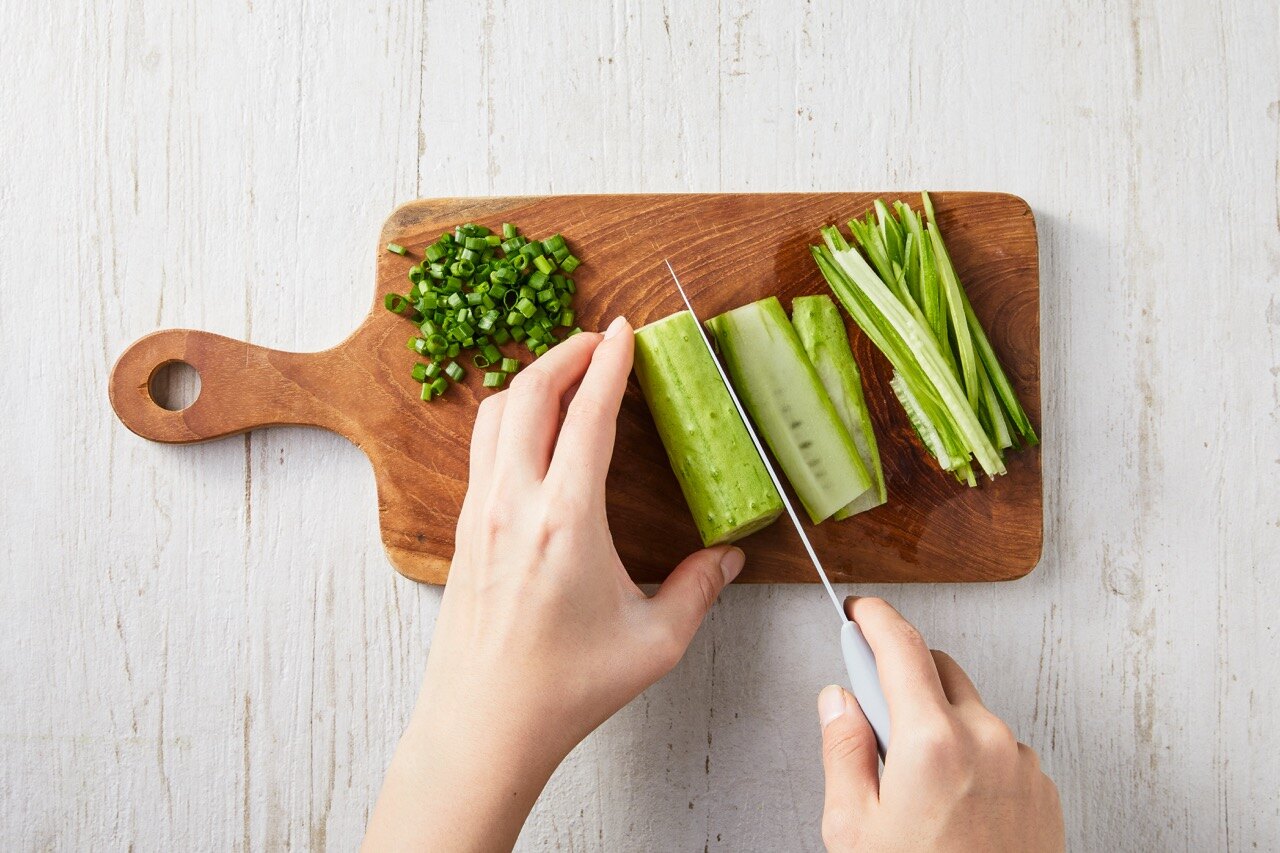 오이는 길게 채 썰고, 쪽파는 송송 썰어 준비해 주세요.