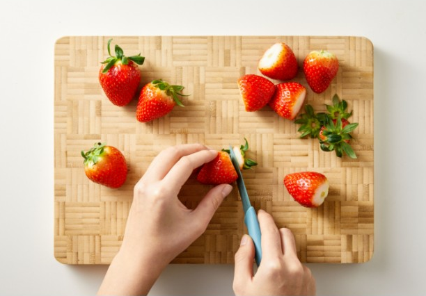 취향에 따라 딸기 꼭지를 칼로 자르거나,