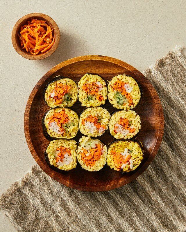 두툼한 계란을 넣어 만든 지단 김밥으로,