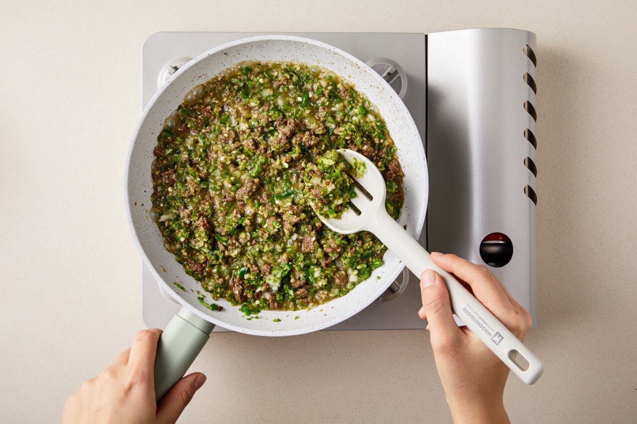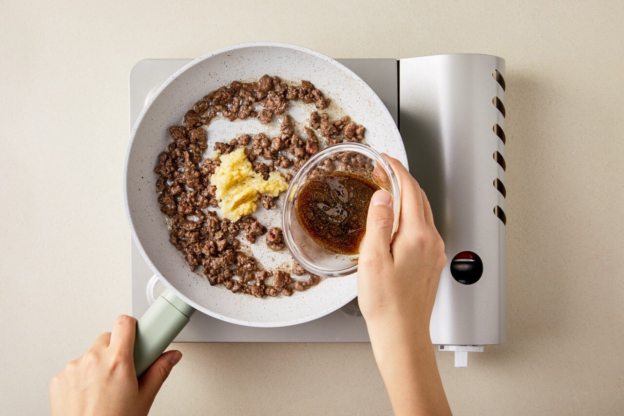 기름을 소량 두른 팬에 한우 다짐육을 볶아 주세요.