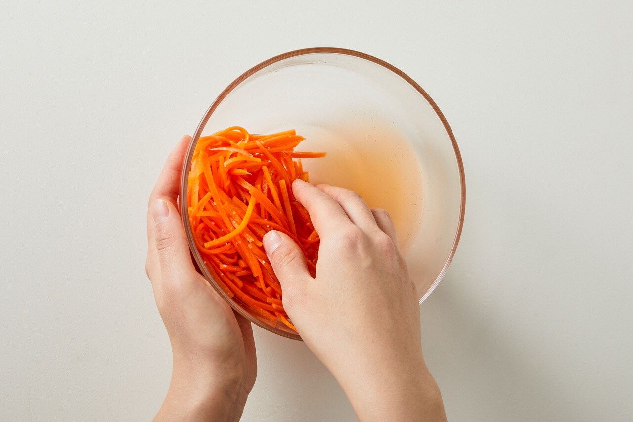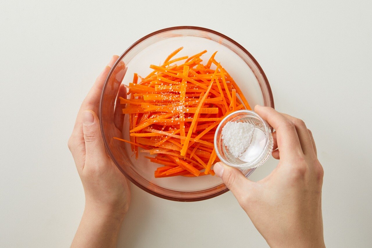 채 썬 당근에 소금 한 꼬집을 넣고 20분간 절여 주세요.