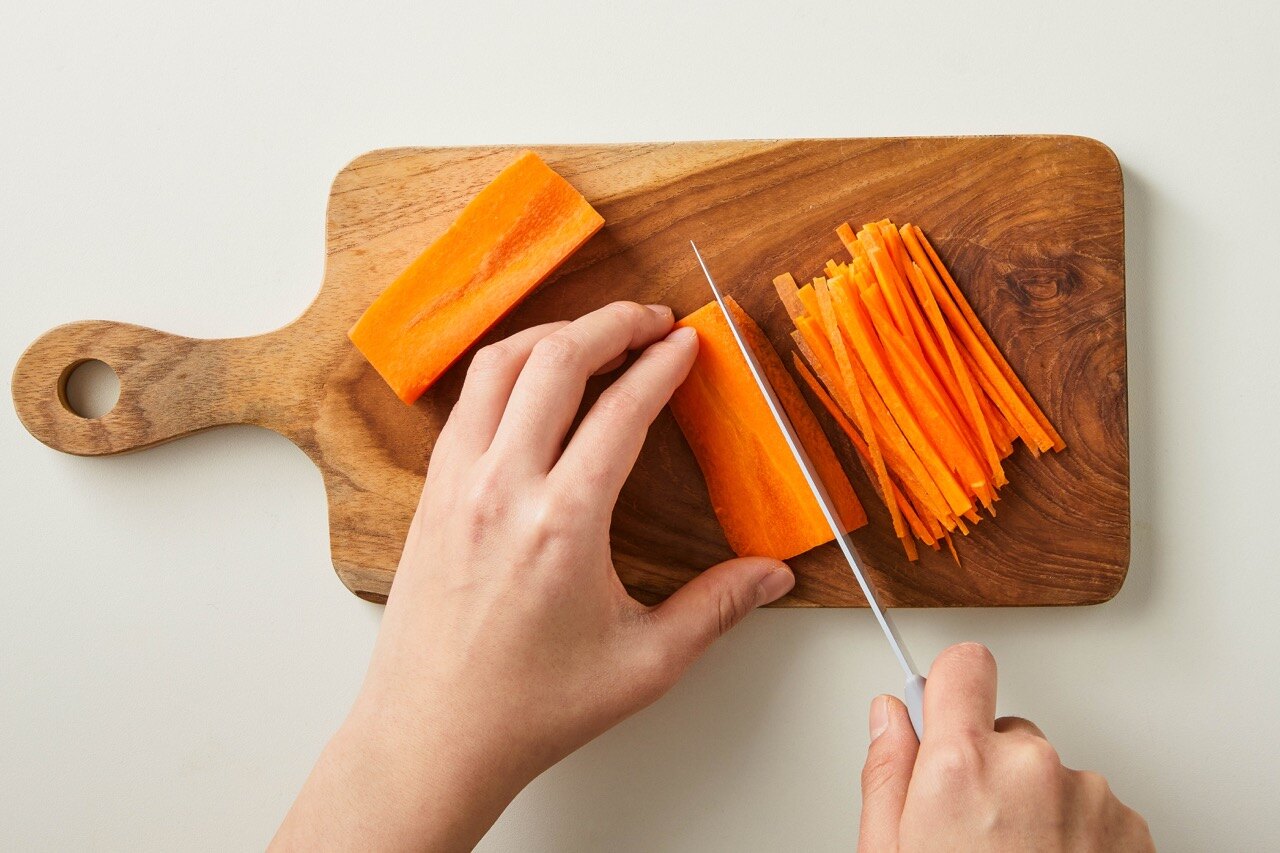 깨끗하게 씻은 당근을 최대한 얇게 채 썰어 주세요.