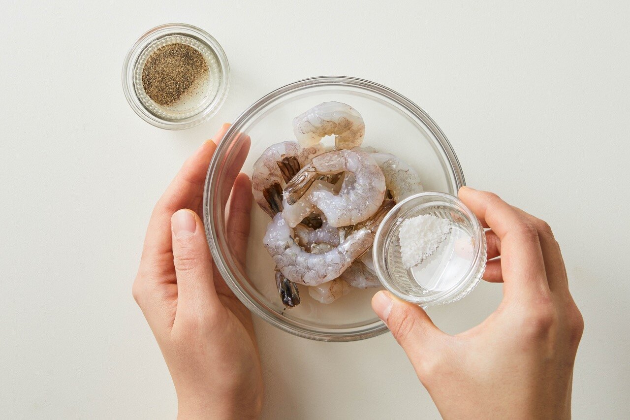 당근이 절여지는 동안, 새우에 소금 한 꼬집, 후추 한 꼬집을 넣고 밑간을 해둬요.