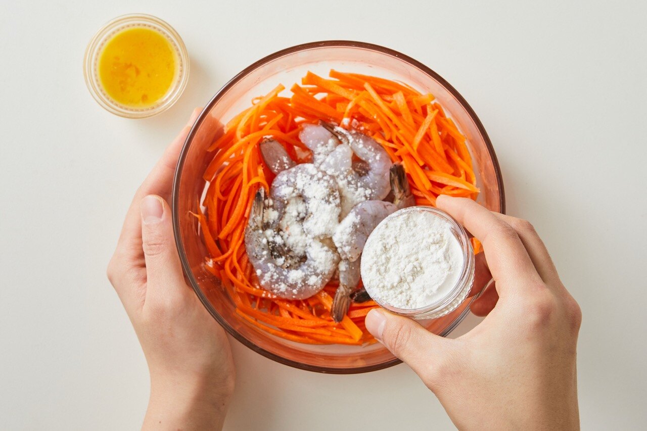 절인 당근에 부침가루, 달걀, 새우를 넣고 섞어 주세요.