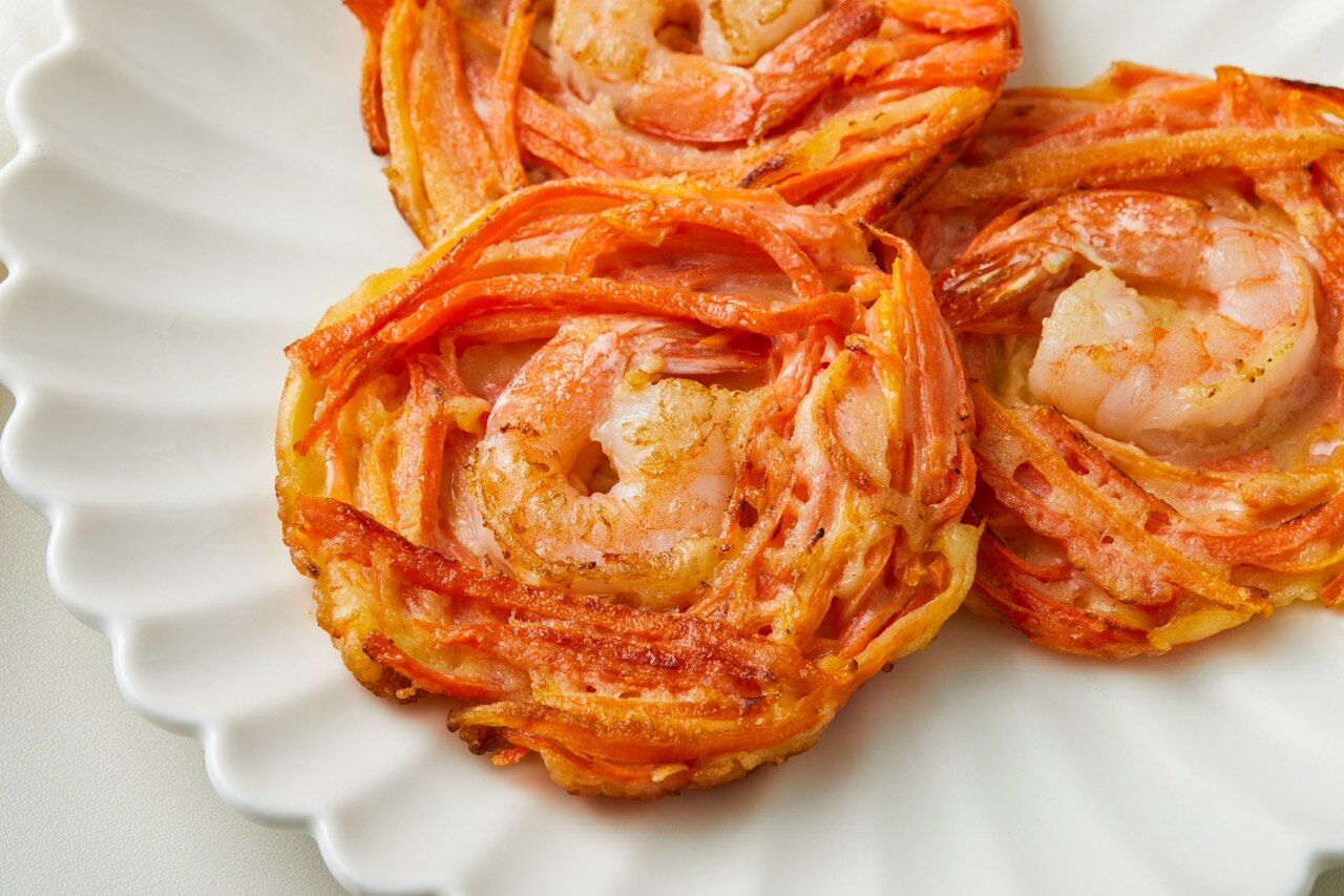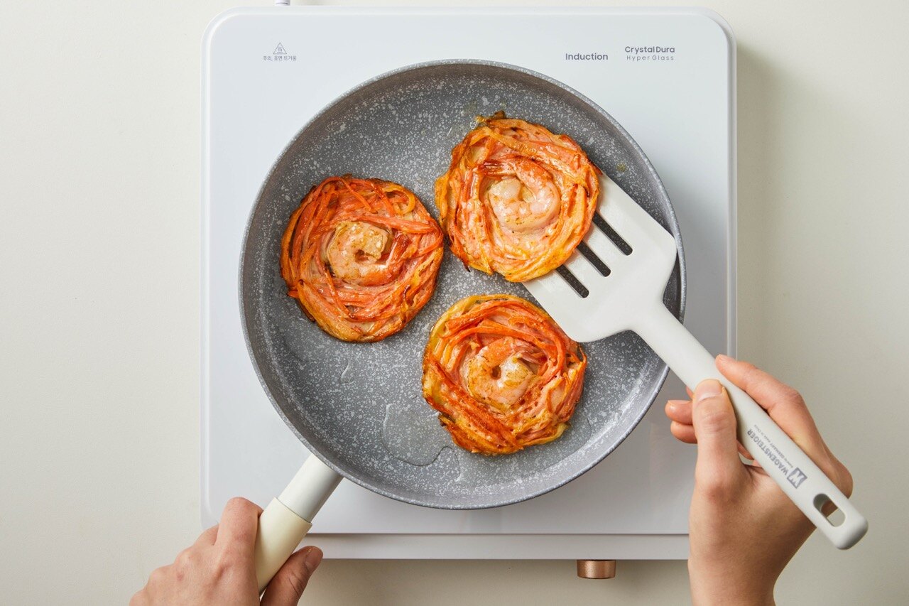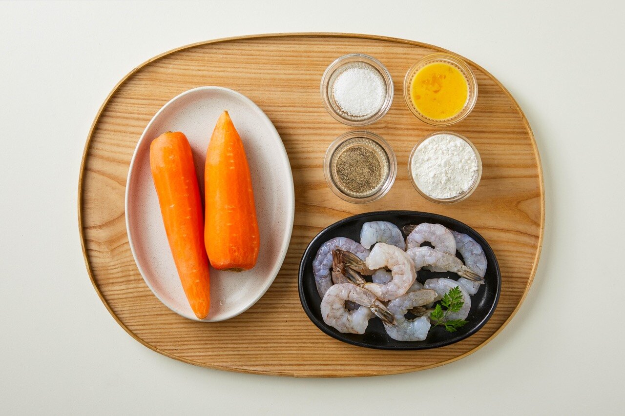 바삭한 식감과 은은한 단맛의 당근 새우전 완성이에요.
