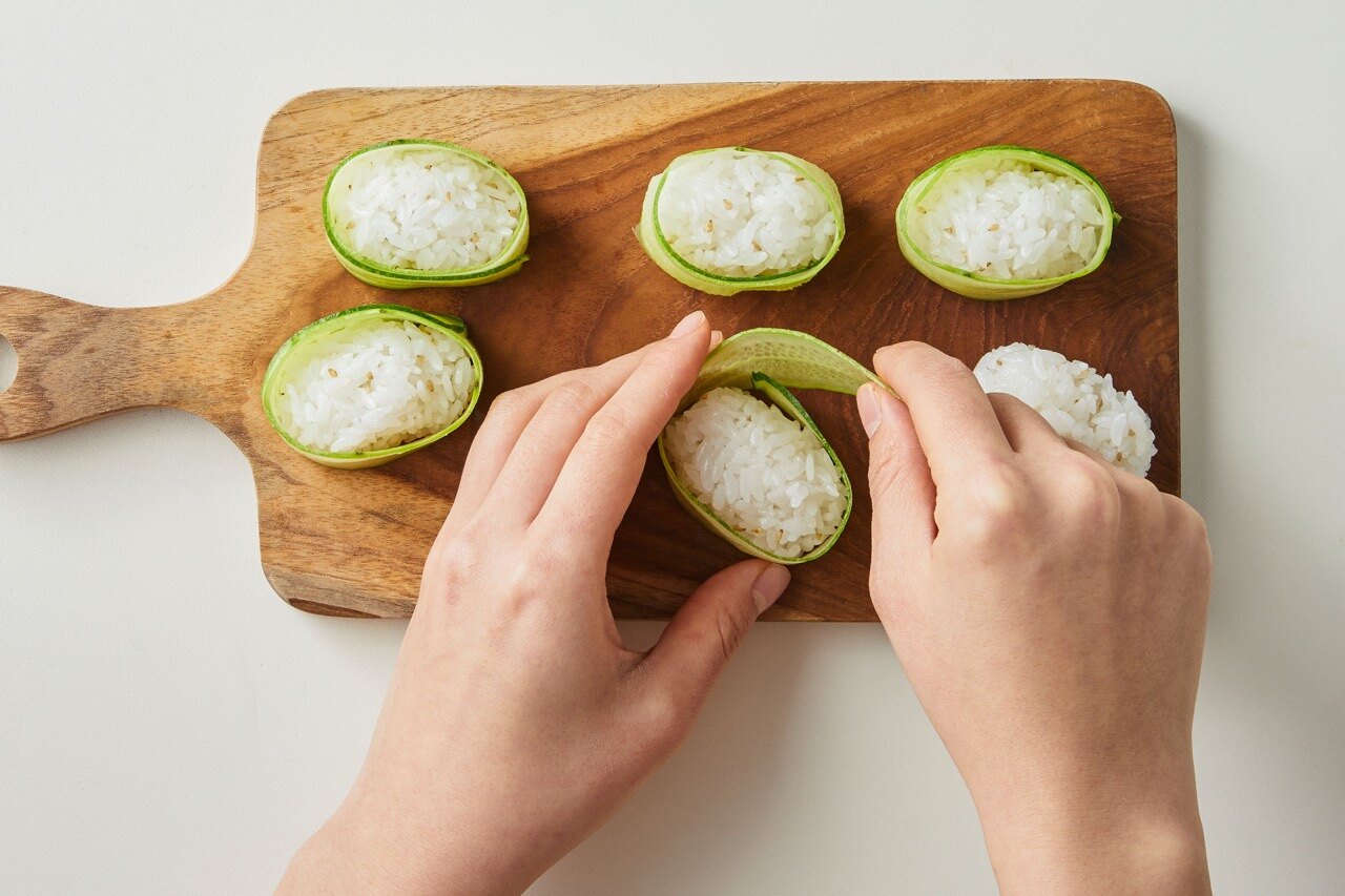 밥을 감싸듯 오이로 돌돌 말아 주세요.