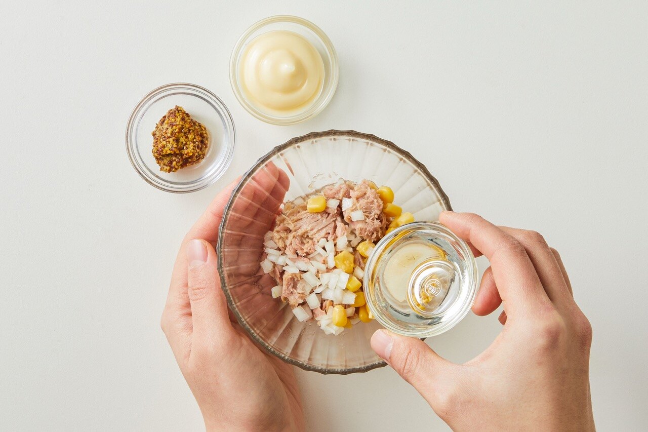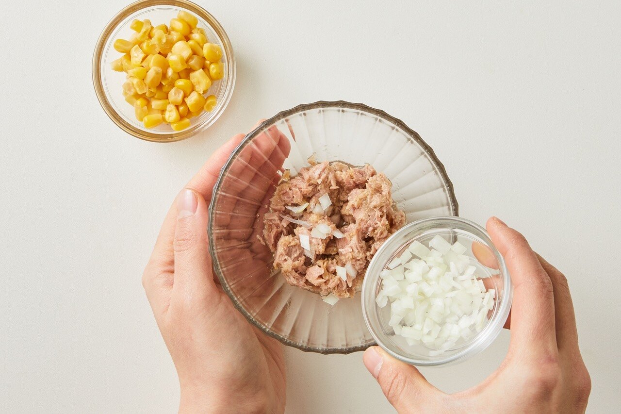 기름기를 뺀 참치, 옥수수, 양파를 볼에 담아 주세요.