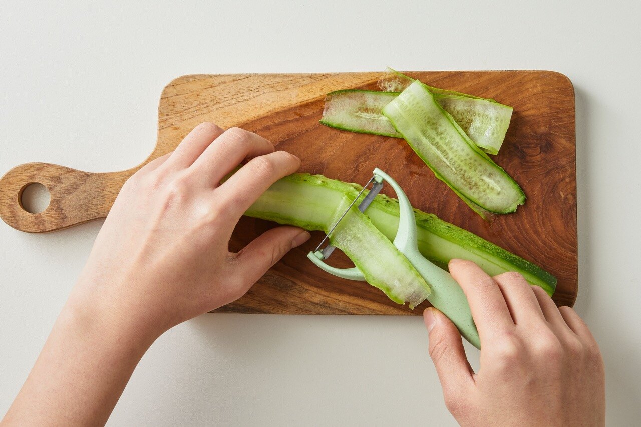 오이를 감자칼로 얇게 슬라이스 해주세요.