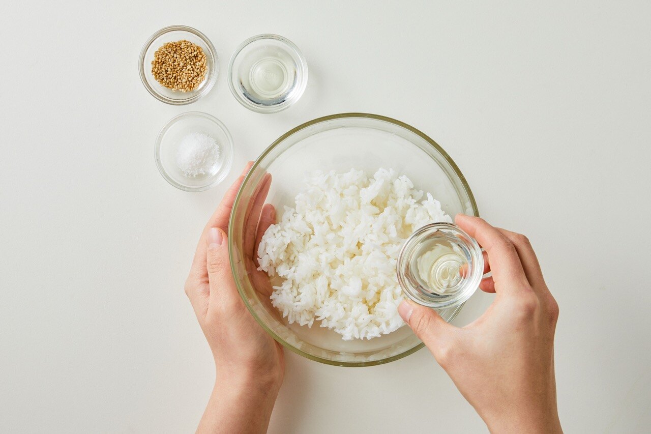 밥에 소금, 식초, 알룰로스 1t, 깨를 넣고 섞어 주세요.