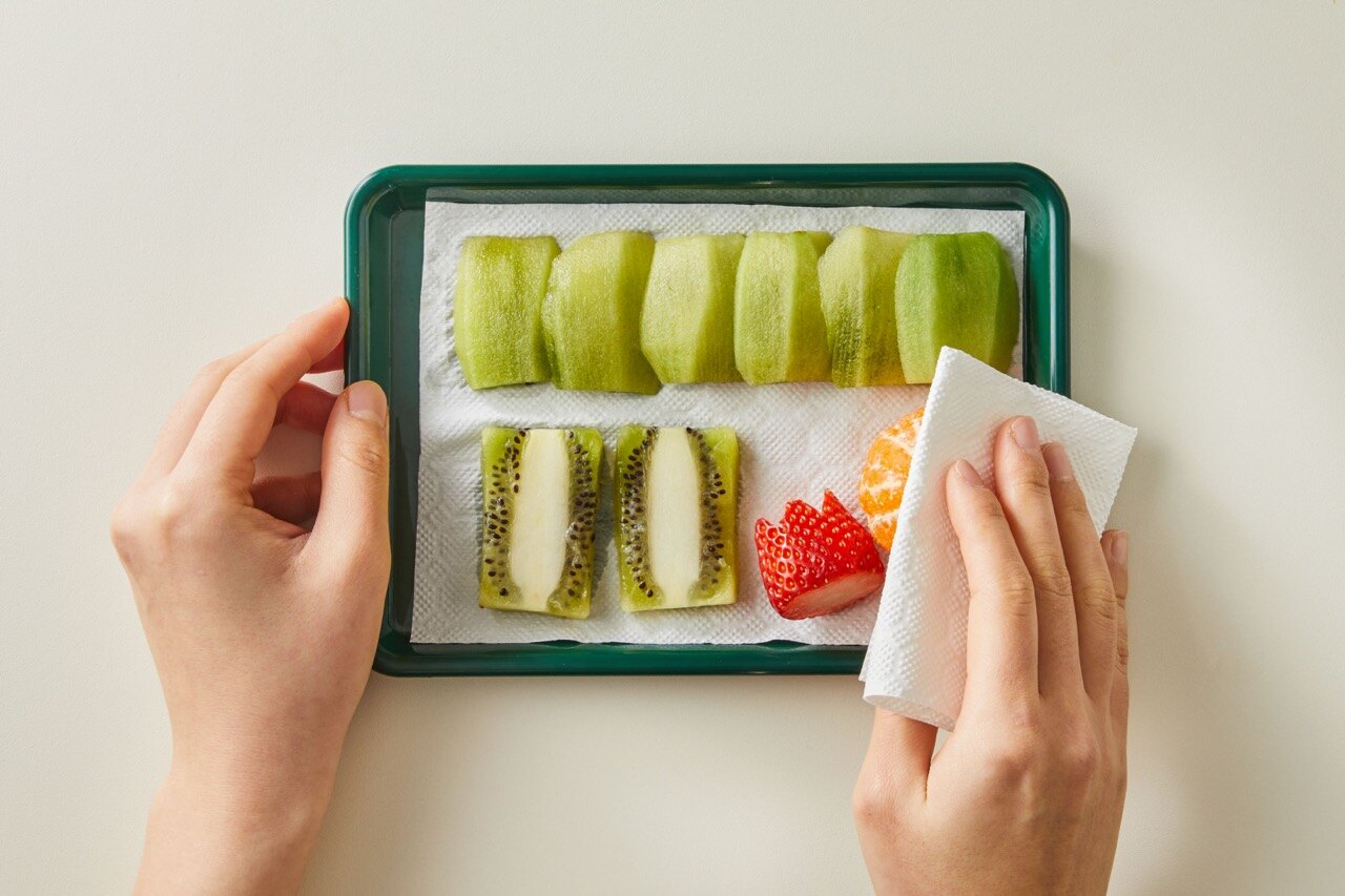 손질해둔 과일을 키친타월에 올려 물기를 제거해 주세요.