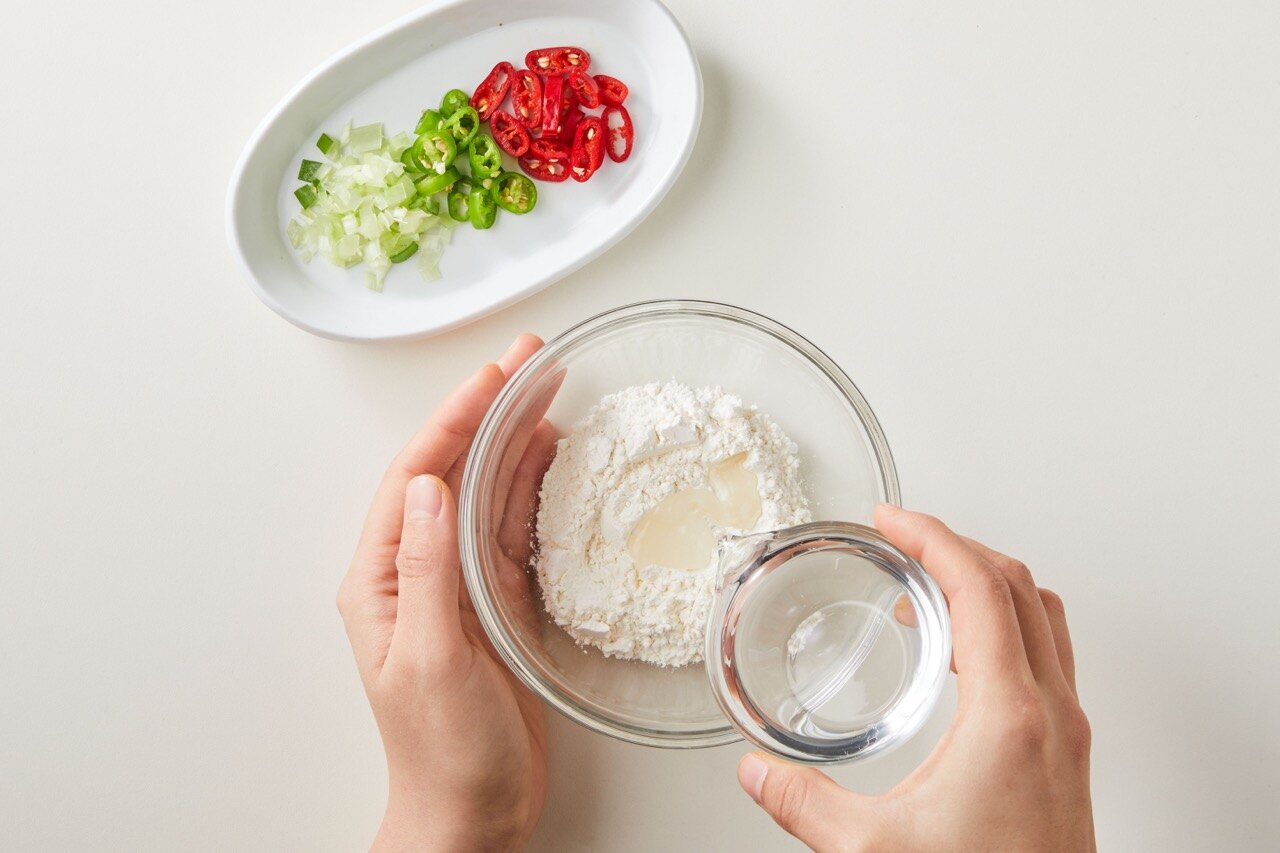 부침가루에 물, 청양고추, 홍고추를 넣고 섞어 주세요.