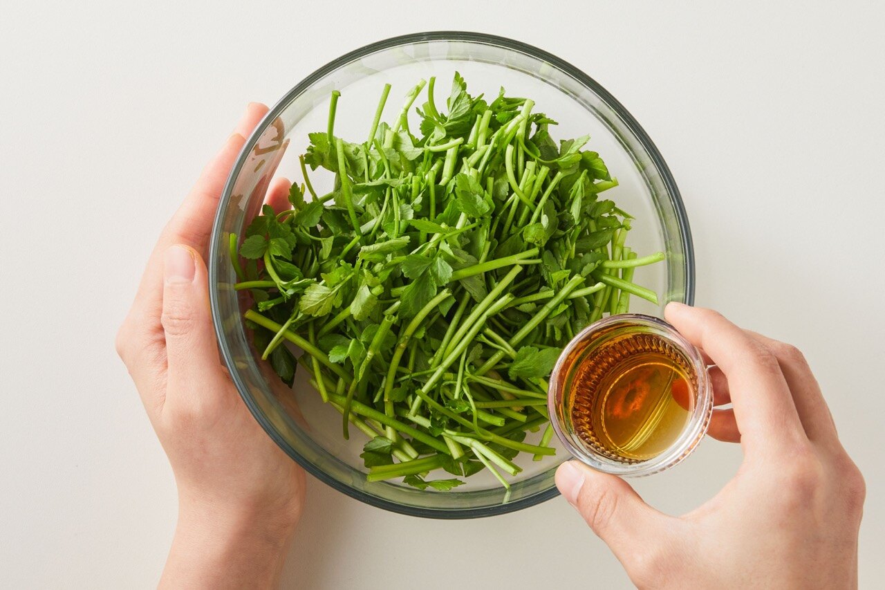 미리 손질해놓은 미나리에 준비한 액젓를 버무려 간을 입혀 주세요.
