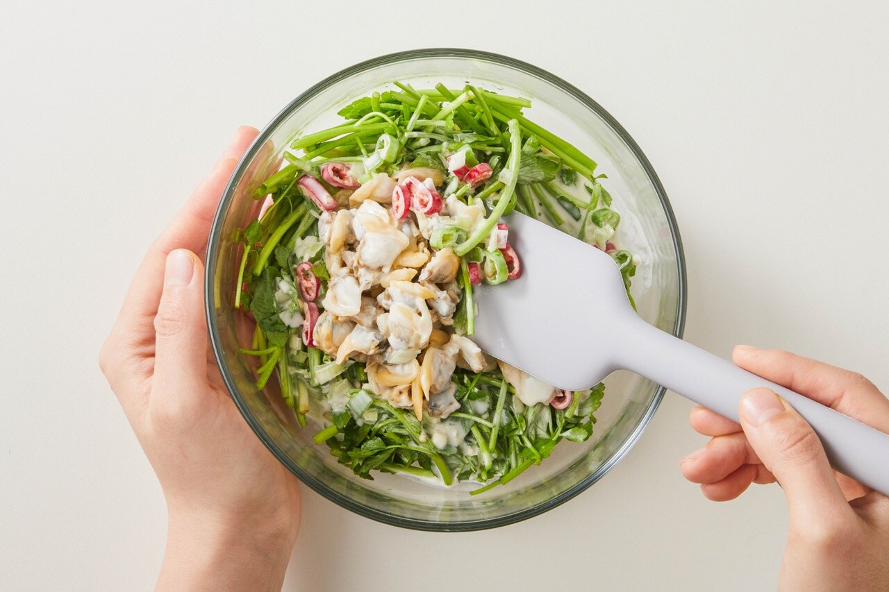 부침가루에 간을 해둔 미나리를 넣고 섞어 주세요.