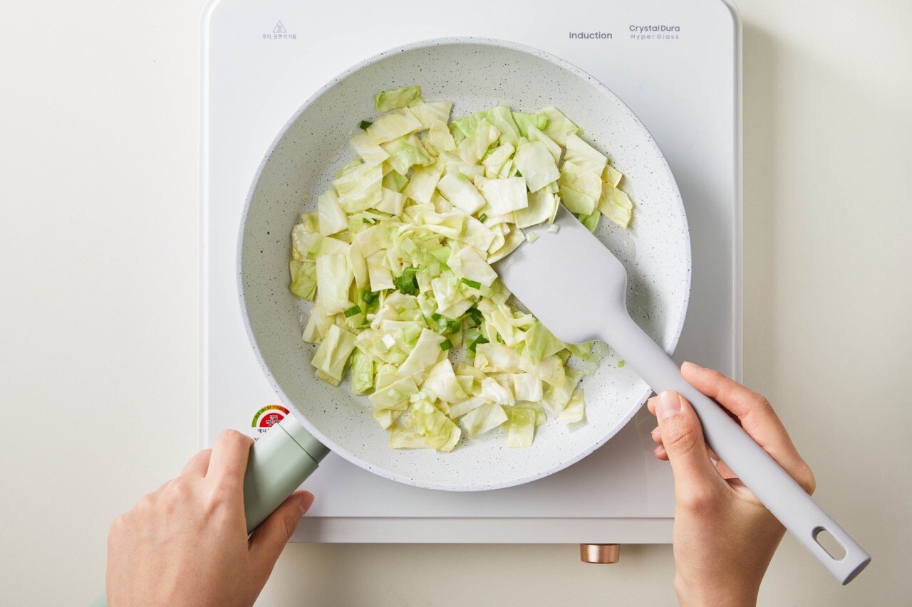 기름을 두른 팬에 손질한 대파와 양배추를 볶아 주세요.