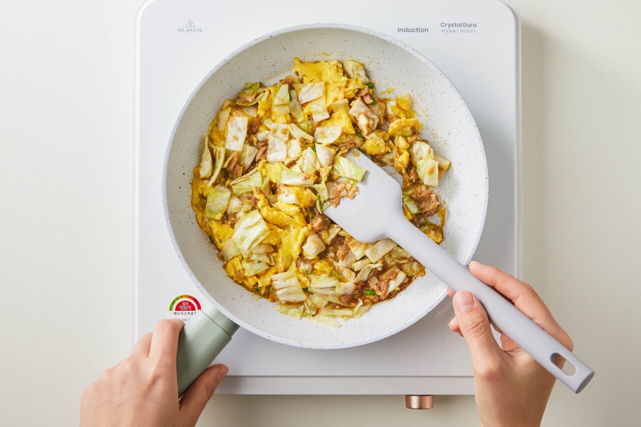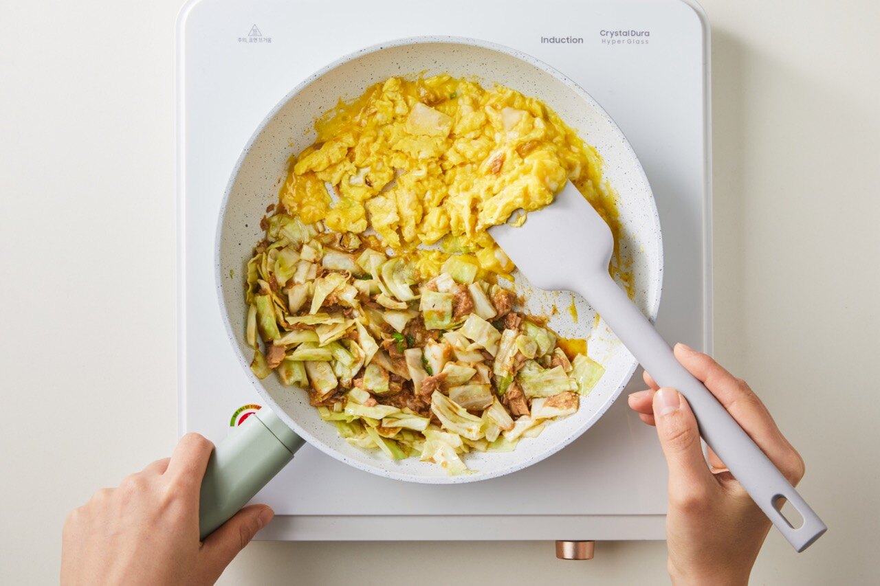 볶고 있는 재료들을 프라이팬 한쪽으로 밀어 넣은 뒤,