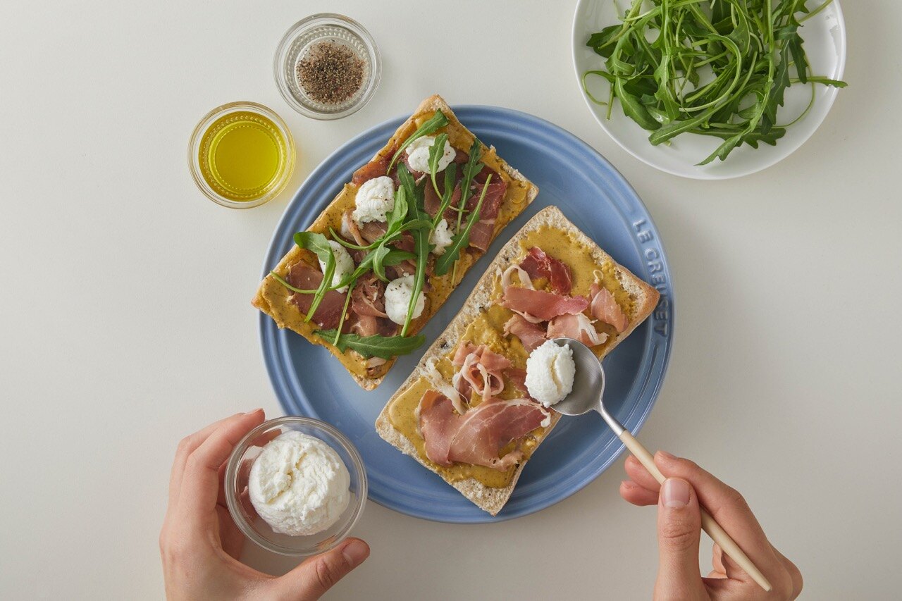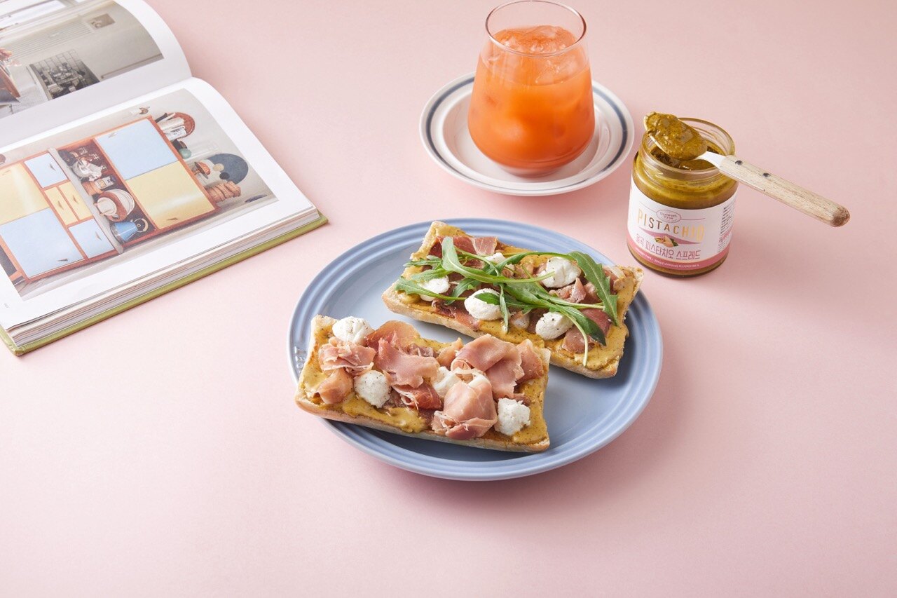 구운 빵에 피스타치오 스프레드를 발라주세요.