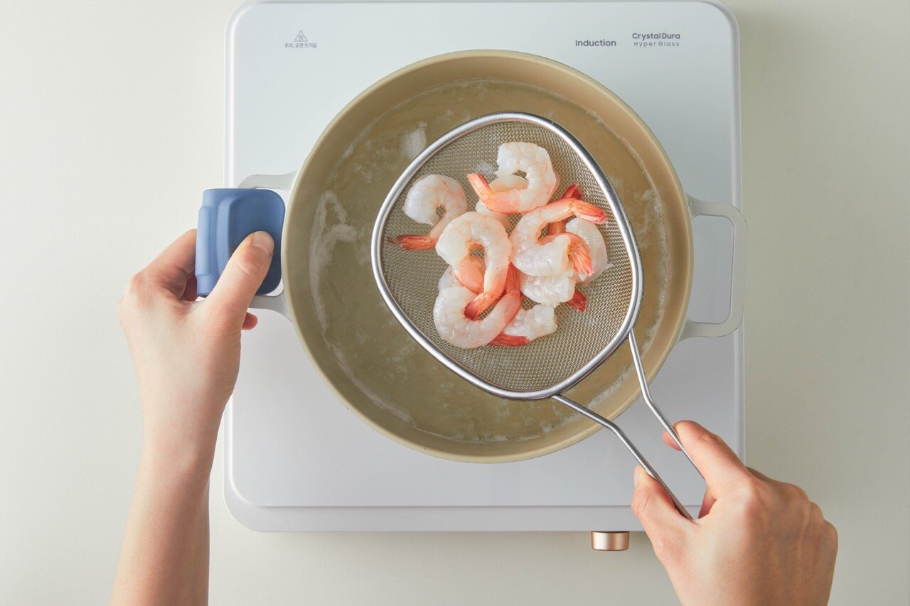 끓는 물에 새우를 1분 가량 데쳐 주세요.