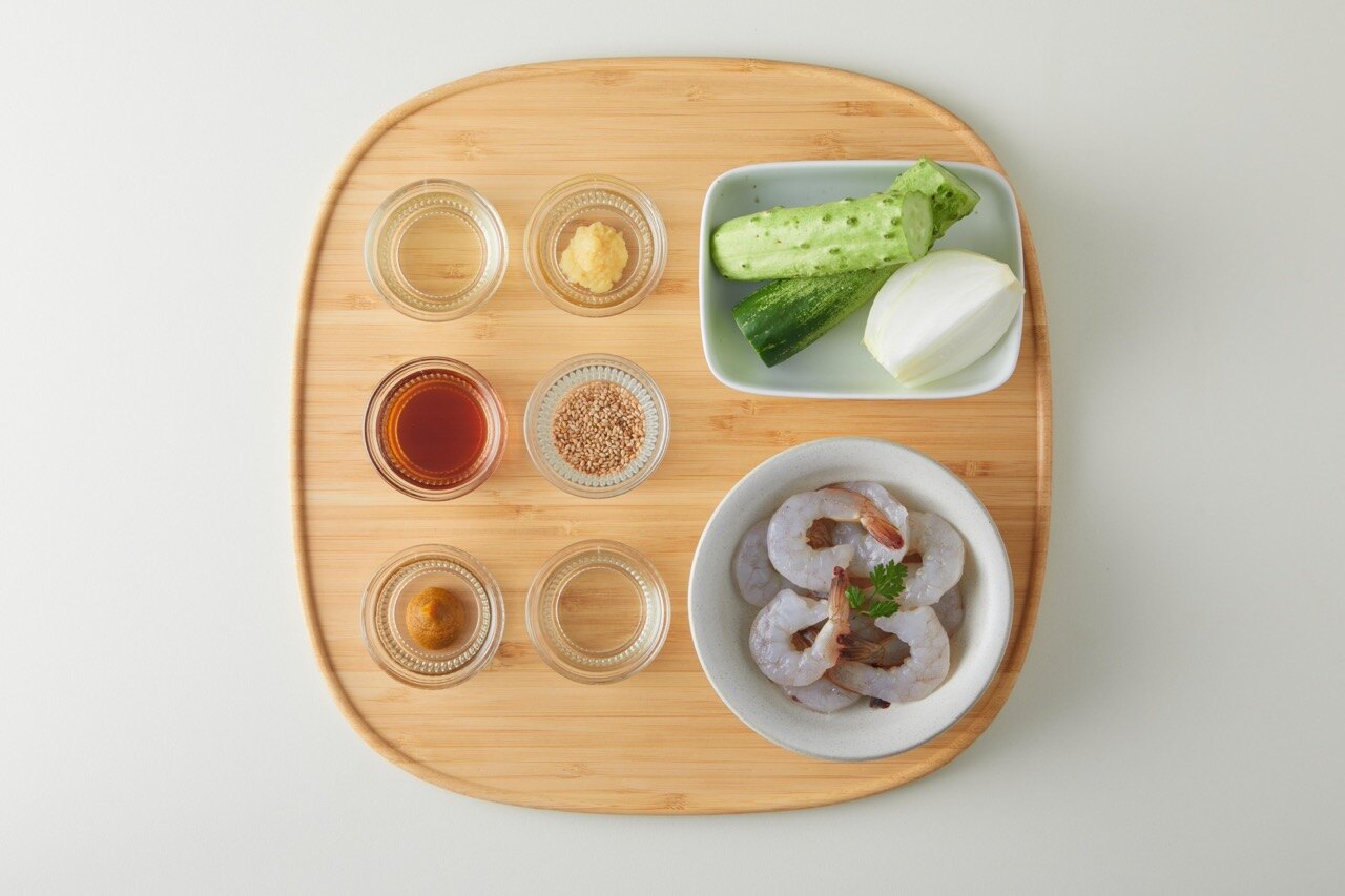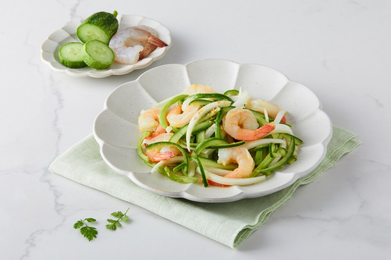 살짝 데친 새우에 소금에 절인 오이를 더하고,