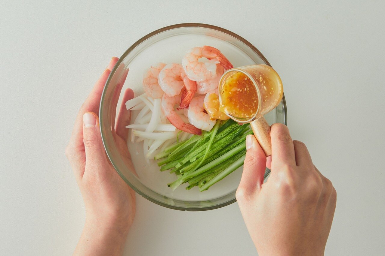 데친 새우와 오이에 준비한 소스를 넣고 가볍게 버무려 주세요.