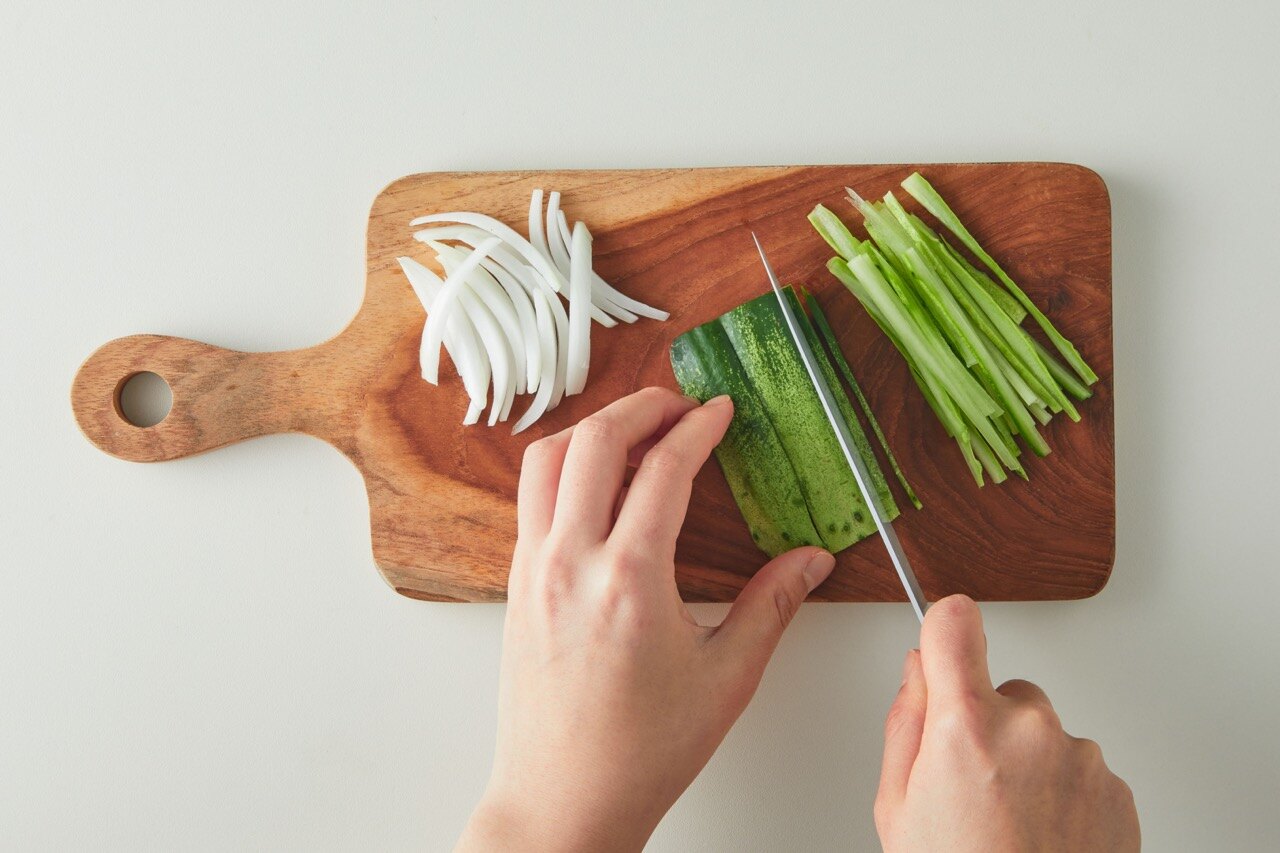 돌려 깎은 후, 채썰고, 양파도 채썰어 주세요.
