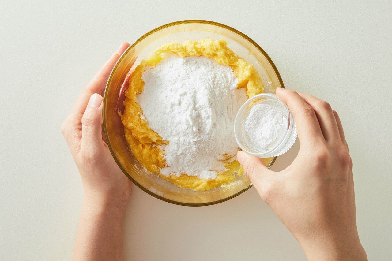 쌀가루, 베이킹 파우더도 넣고 잘 섞어주세요.