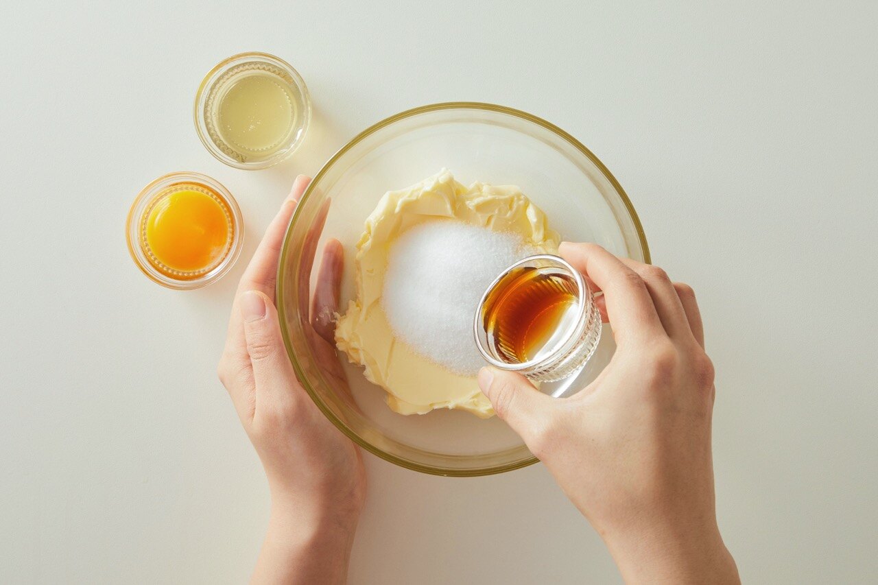 버터에 설탕, 꿀, 노른자, 바닐라 익스트랙을 넣고 잘 섞어주세요.