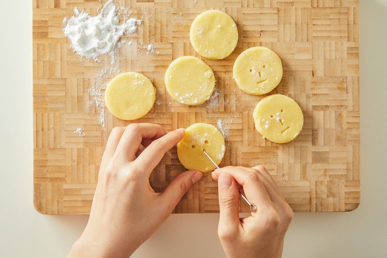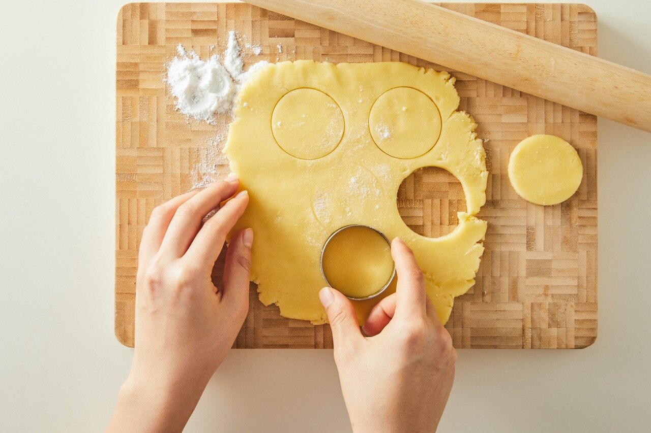 숙성한 반죽을 7mm 두께로 밀어준 뒤, 쿠키 커터로 모양을 내주세요.